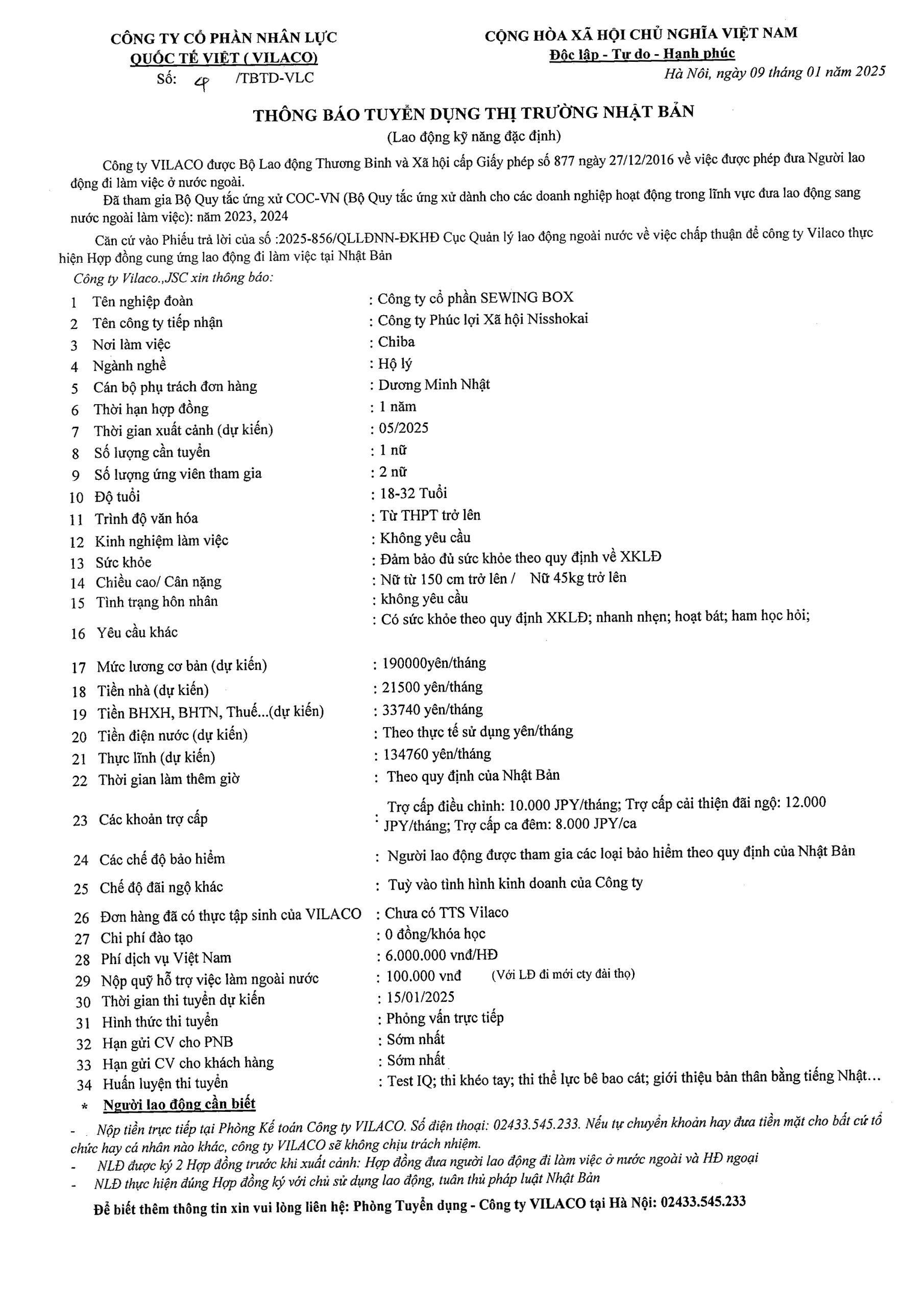 By admin 09/01/2025 No Comments 04/2025 TBTD-VLC: Thông báo tuyển dụng Đơn hàng Đặc định sinh ngành Hộ lý tại tỉnh Chiba – Nhật Bản