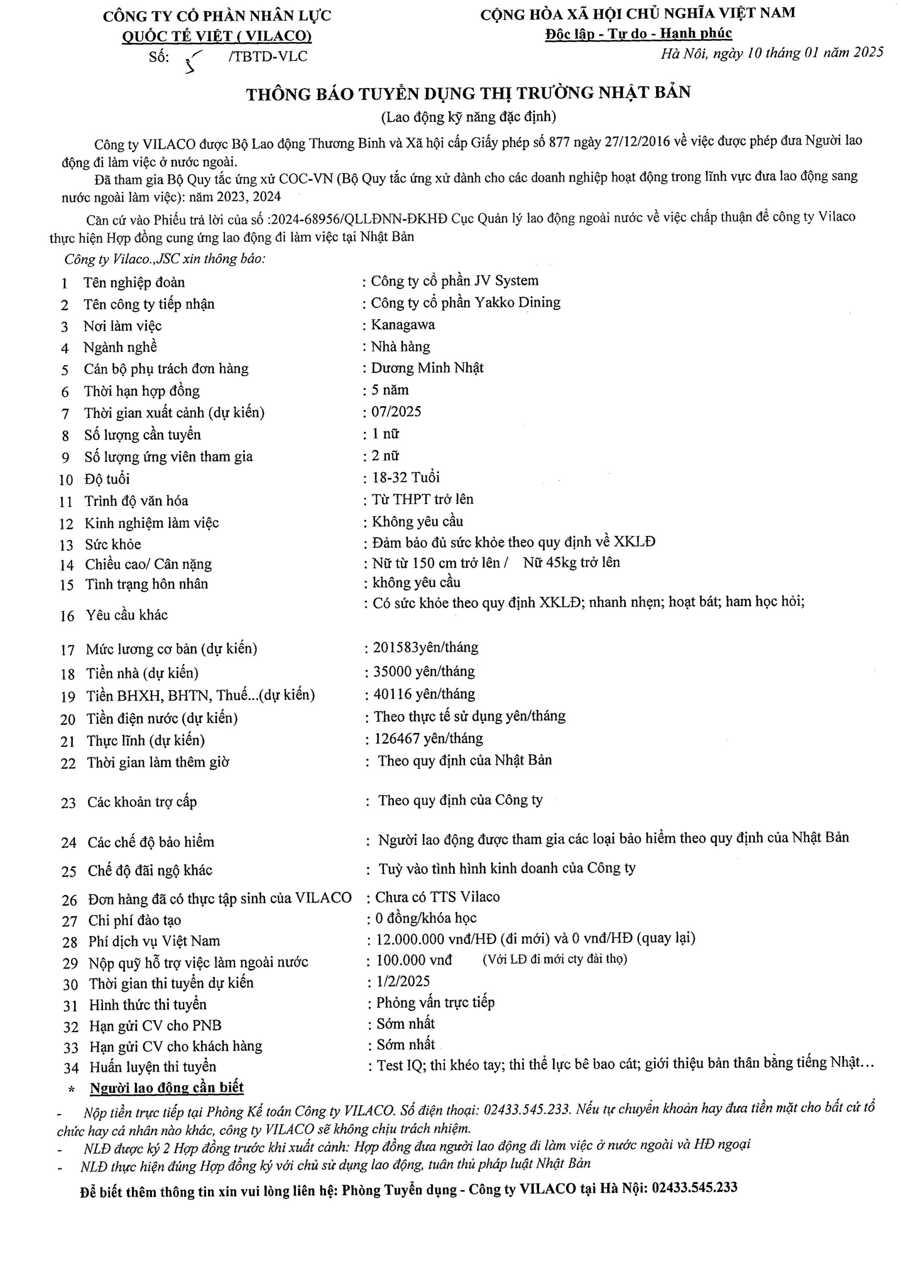 By admin 10/01/2025 No Comments 05/2025 TBTD-VLC: Thông báo tuyển dụng Đơn hàng Đặc định sinh ngành Nhà hàng tại tỉnh Kangawa – Nhật Bản
