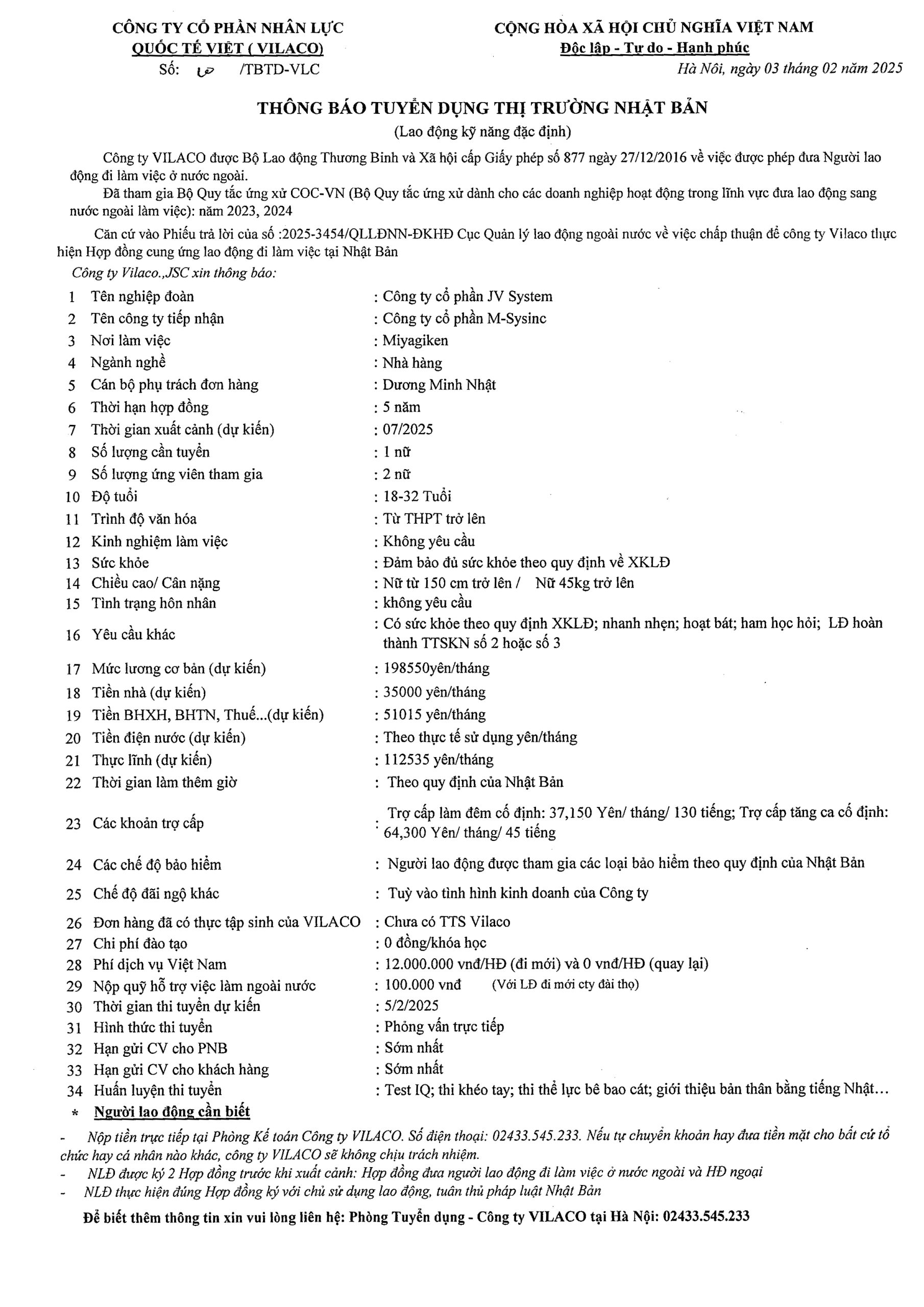By admin 03/02/2025 No Comments 10/2025 TBTD-VLC: Thông báo tuyển dụng Đơn hàng Đặc định ngành Nhà hàng tại tỉnh Miyagi – Nhật Bản
