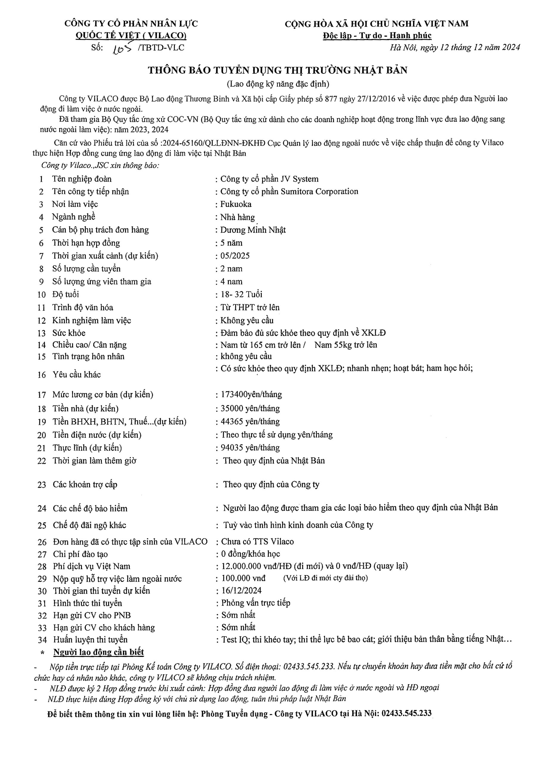 By admin 12/12/2024 No Comments 105/2024 TBTD-VLC: Thông báo tuyển dụng Đơn hàng Đặc định ngành Nhà hàng tại tỉnh Fukuoka – Nhật Bản