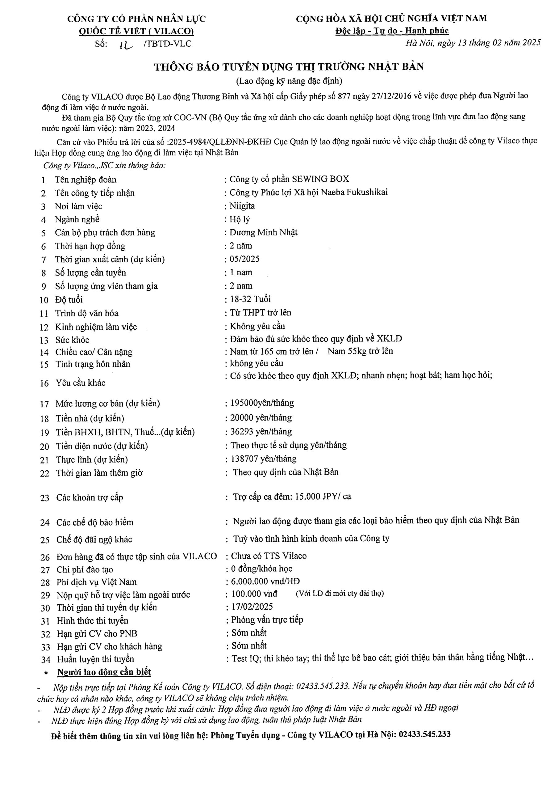 By admin 13/02/2025 No Comments 12/2025 TBTD-VLC: Thông báo tuyển dụng Đơn hàng Đặc định ngành Hộ lý tại tỉnh Niigita – Nhật Bản