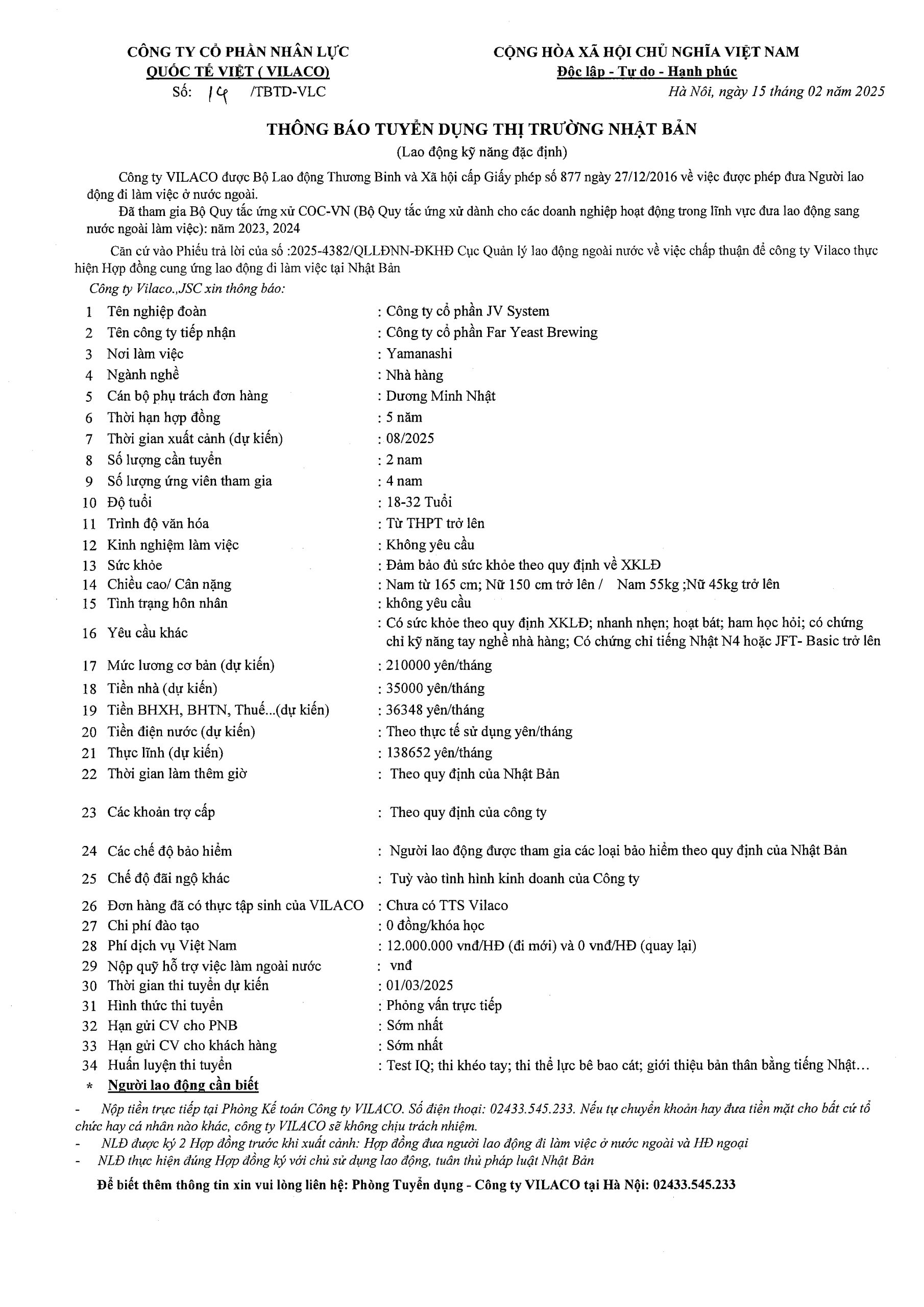 By admin 15/02/2025 No Comments 14/2025 TBTD-VLC: Thông báo tuyển dụng Đơn hàng Đặc định ngành Nhà hàng tại tỉnh Yamanashi – Nhật Bản