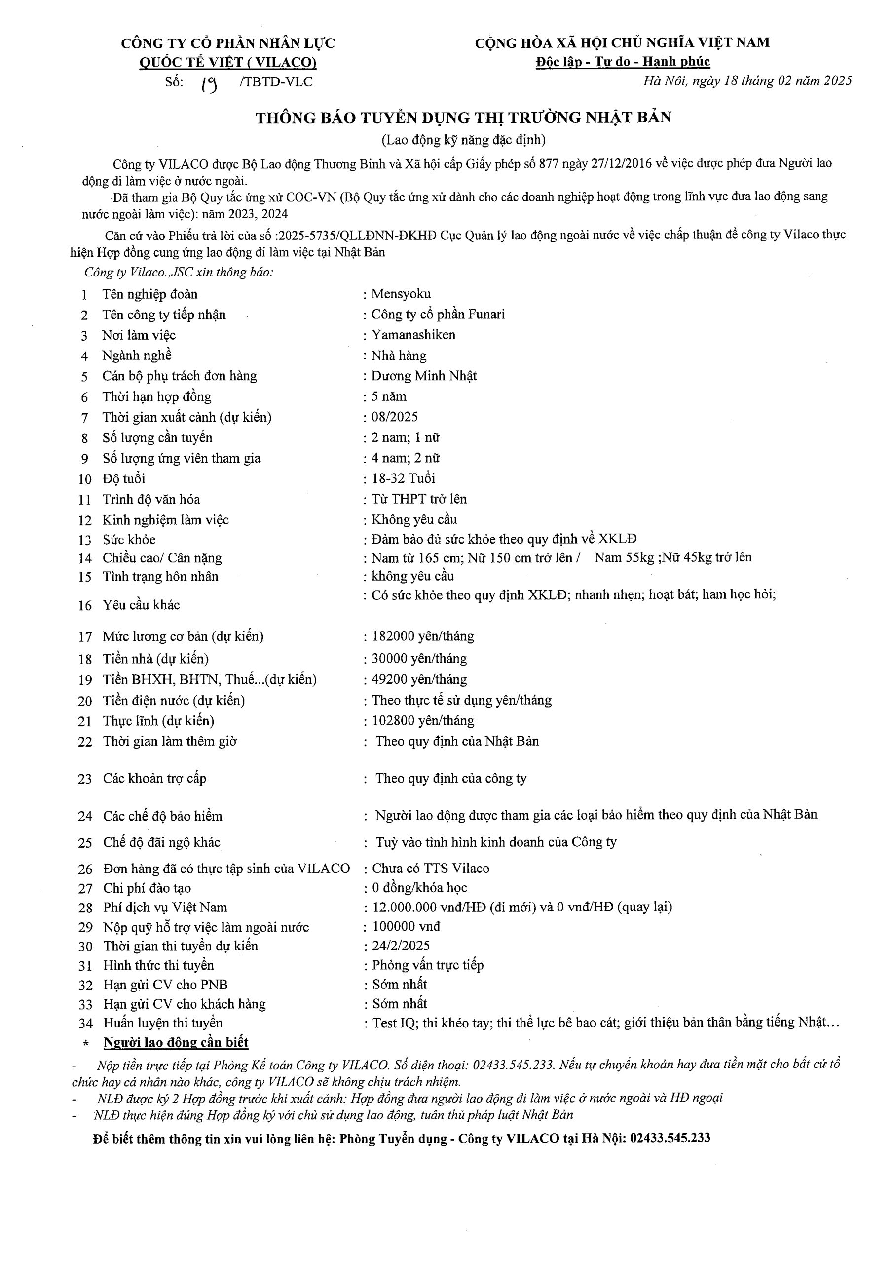 By admin 18/02/2025 No Comments 19/2025 TBTD-VLC: Thông báo tuyển dụng Đơn hàng Đặc định ngành Nhà hàng tại tỉnh Yamanashi – Nhật Bản
