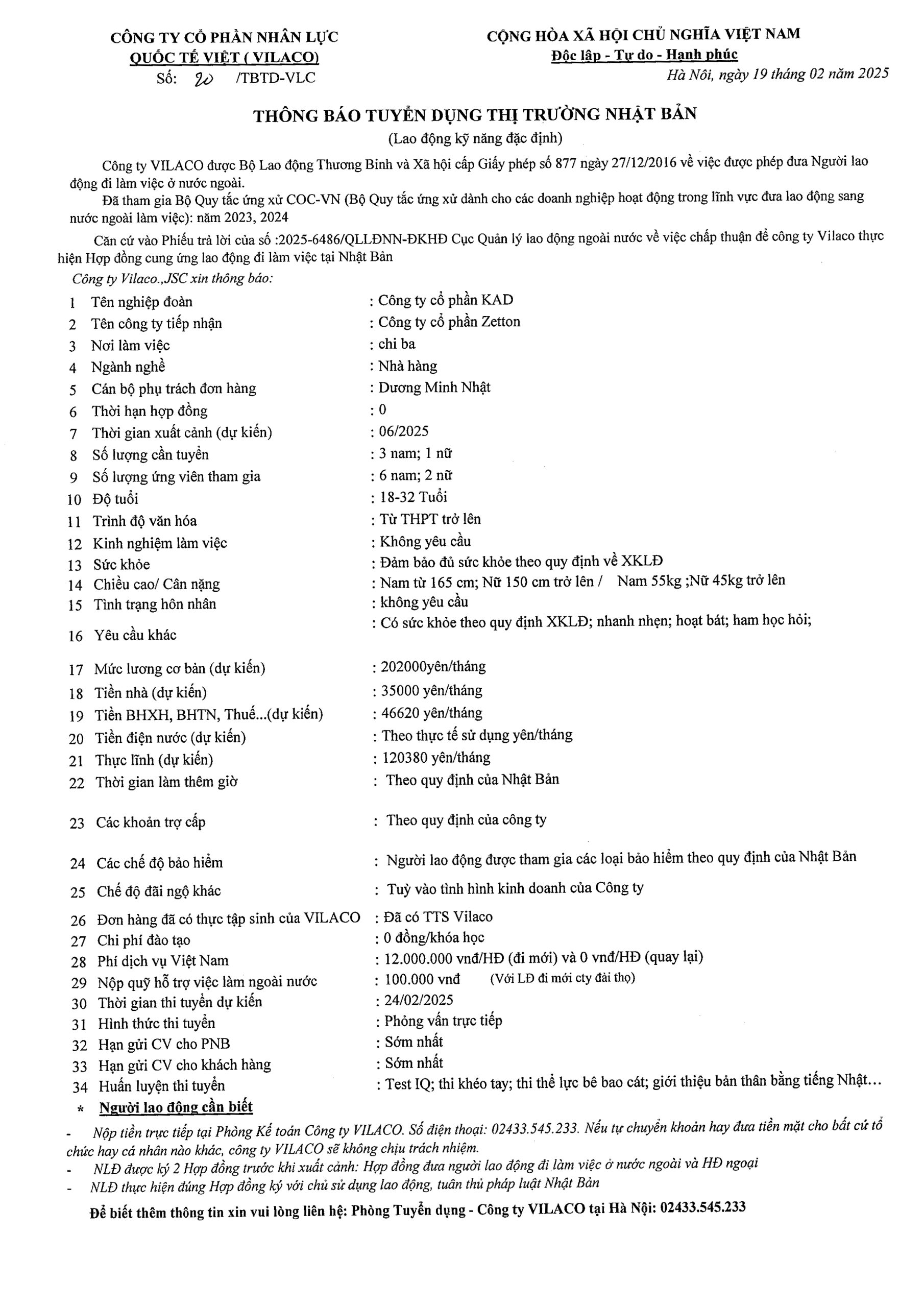 By admin 19/02/2025 No Comments 20/2025 TBTD-VLC: Thông báo tuyển dụng Đơn hàng Đặc định ngành Nhà hàng tại tỉnh Tokyo – Nhật Bản