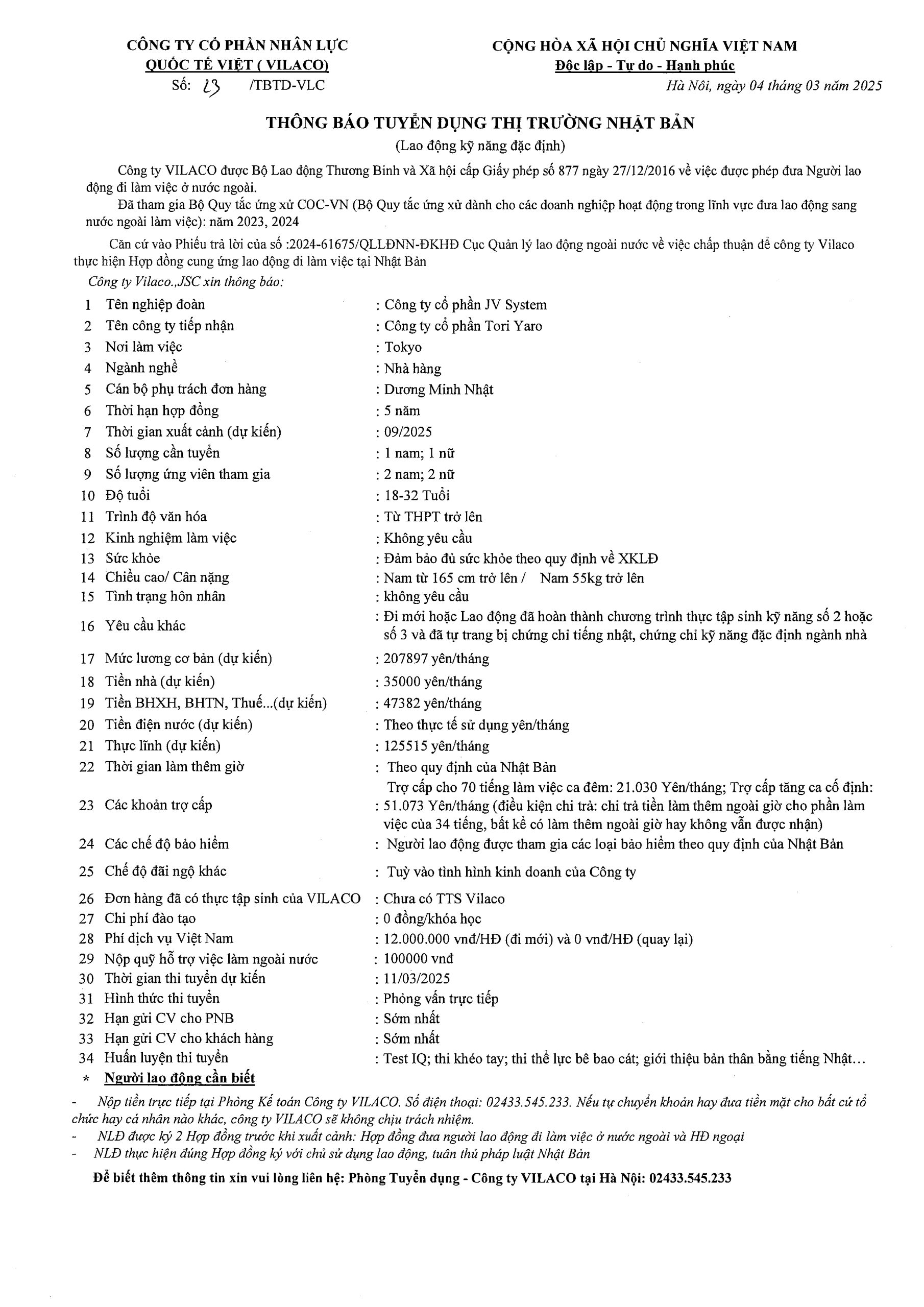 By admin 04/03/2025 No Comments 23/2025 TBTD-VLC: Thông báo tuyển dụng Đơn hàng Đặc định ngành Nhà hàng tại tỉnh Tokyo – Nhật Bản