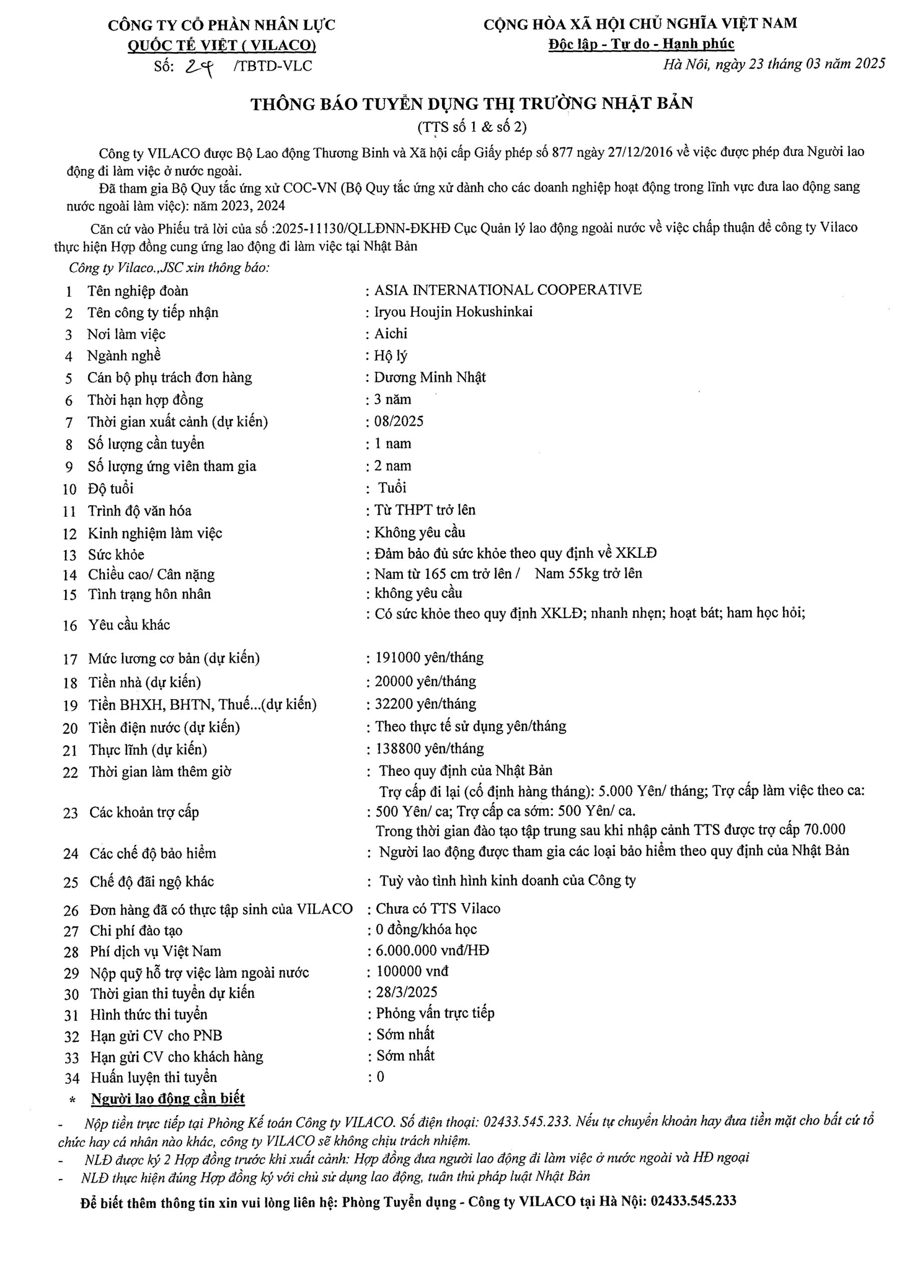 By admin 23/03/2025 No Comments 24/2025 TBTD-VLC: Thông báo tuyển dụng Đơn hàng Thực tập sinh ngành Hộ lý tại tỉnh Aichi – Nhật Bản