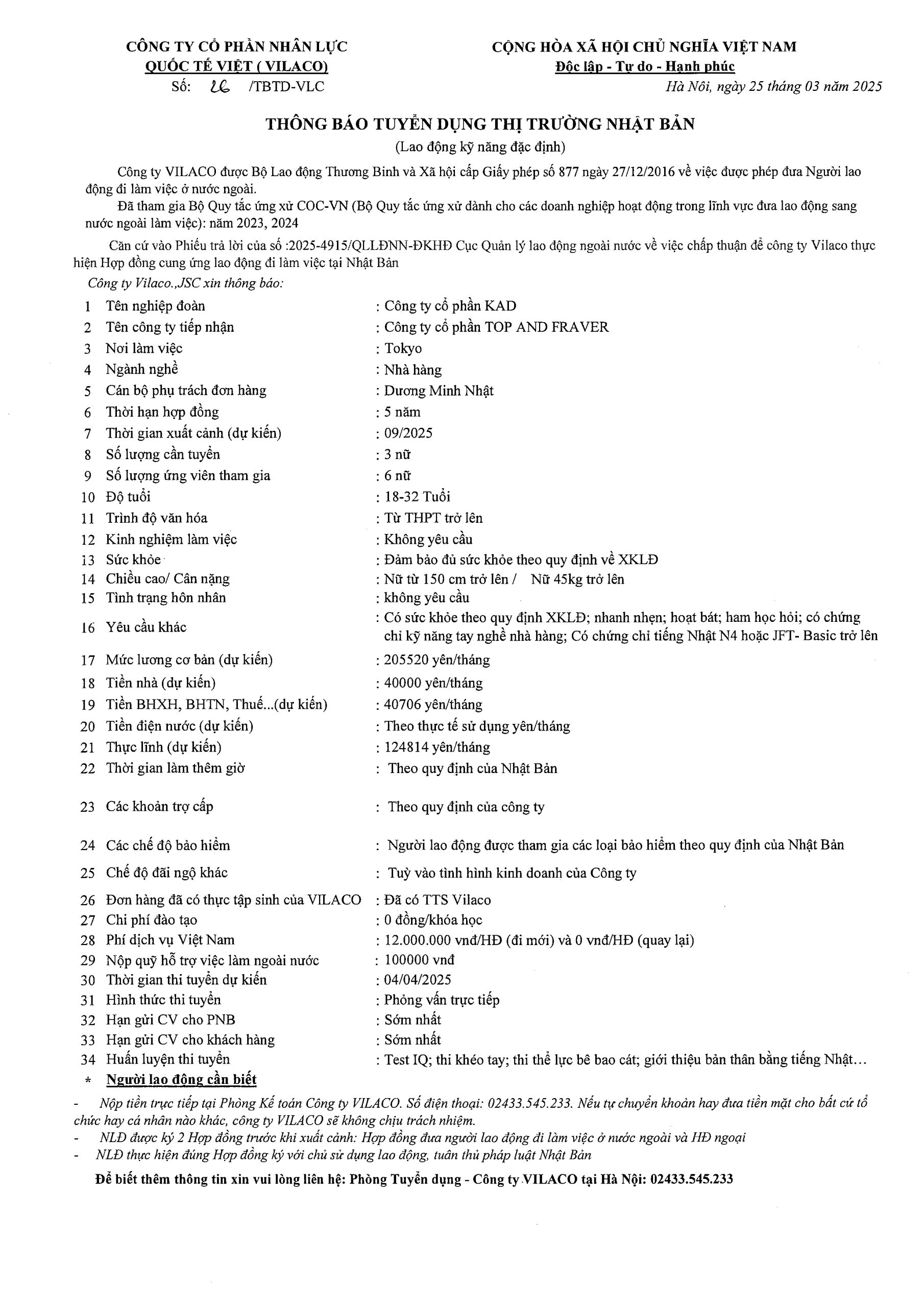 By admin 25/03/2025 No Comments 26/2025 TBTD-VLC: Thông báo tuyển dụng Đơn hàng Đặc định ngành Nhà hàng tại tỉnh Tokyo – Nhật Bản