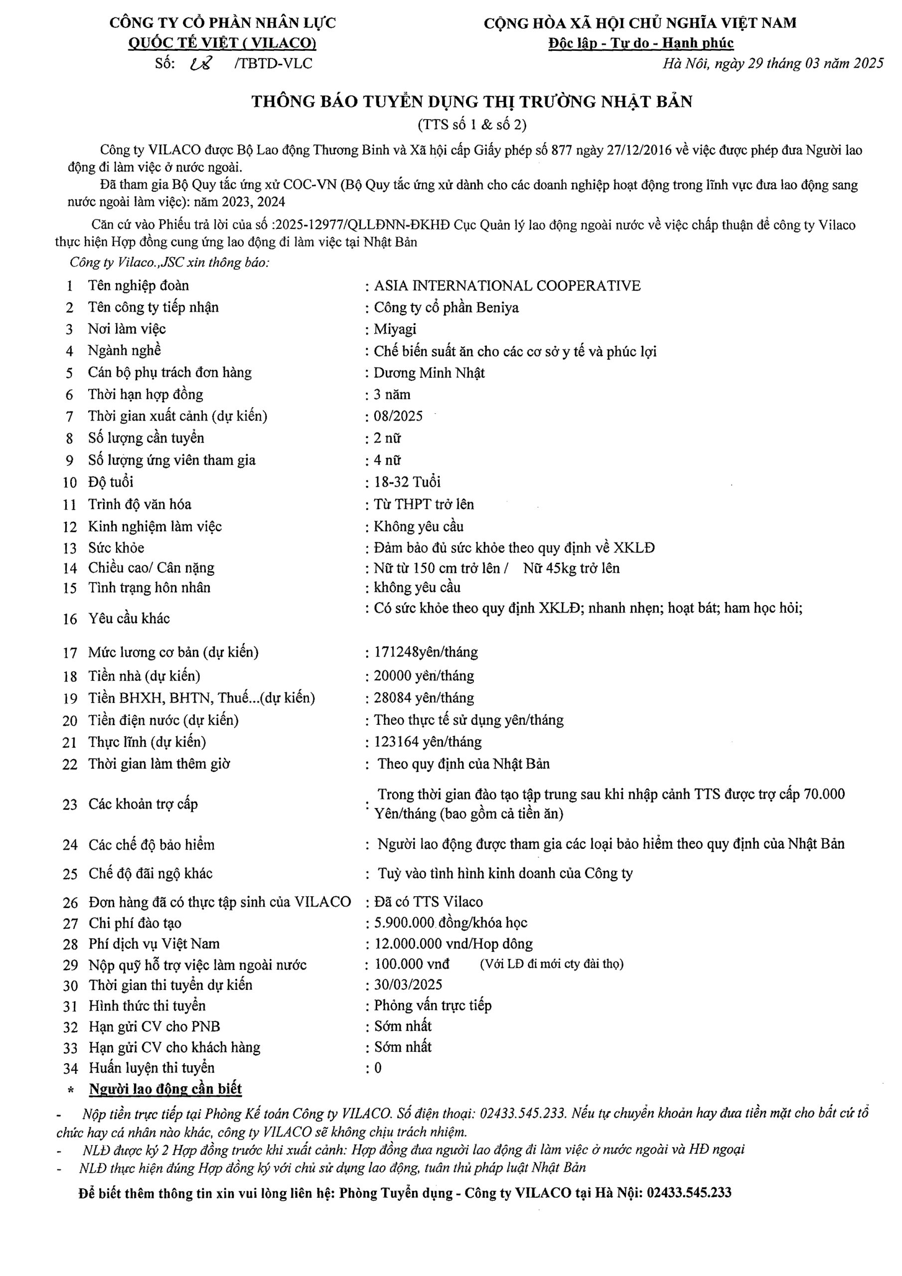 28/2025 TBTD-VLC: Thông báo tuyển dụng Đơn hàng Thực tập sinh ngành Chế biến đồ ăn trong cơ sở y tế và phúc lợi tại tỉnh Tokyo – Nhật Bản