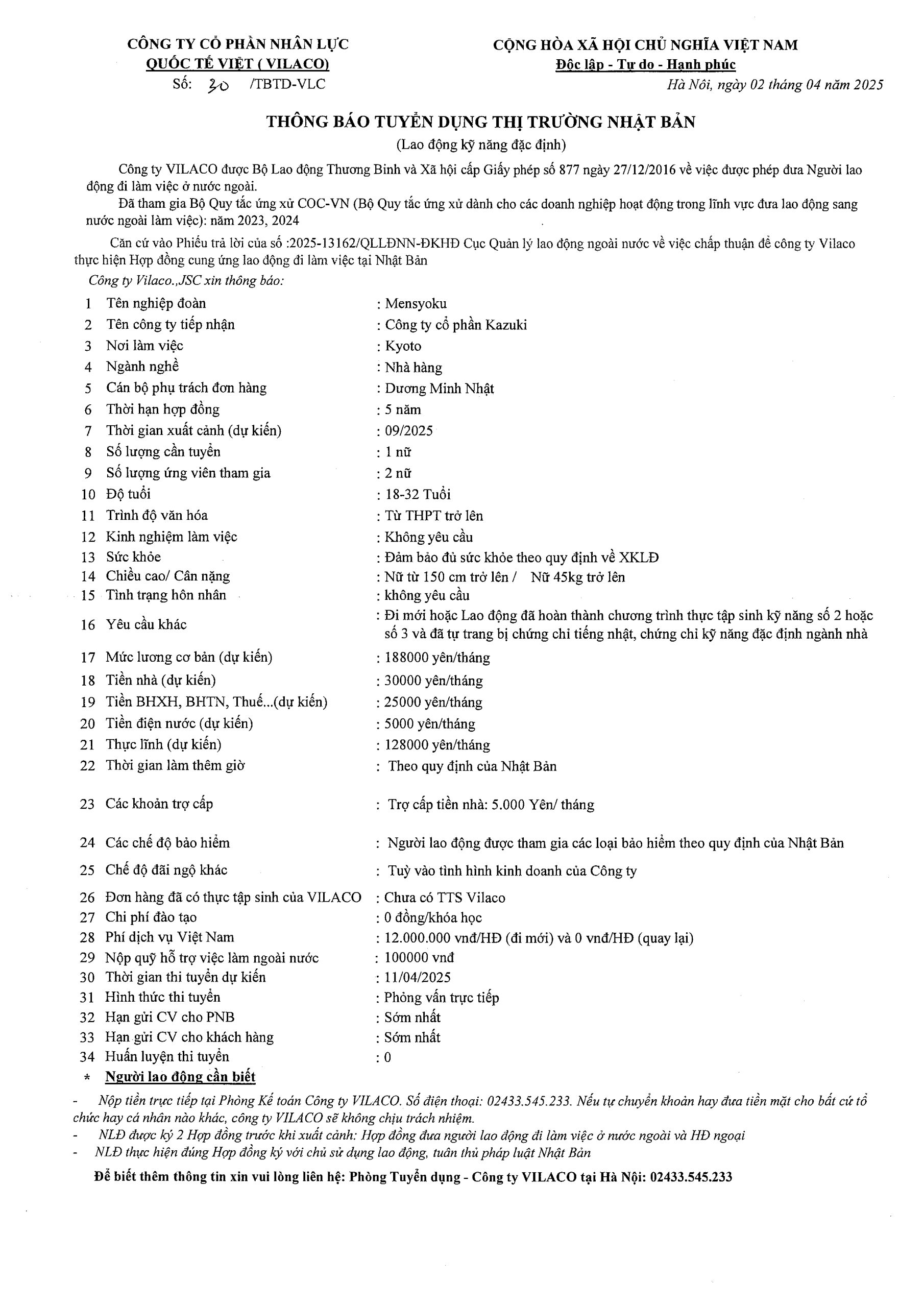 By admin 02/04/2025 No Comments 30/2025 TBTD-VLC: Thông báo tuyển dụng Đơn hàng Đặc định ngành Nhà hàng tại tỉnh Kyoto – Nhật Bản
