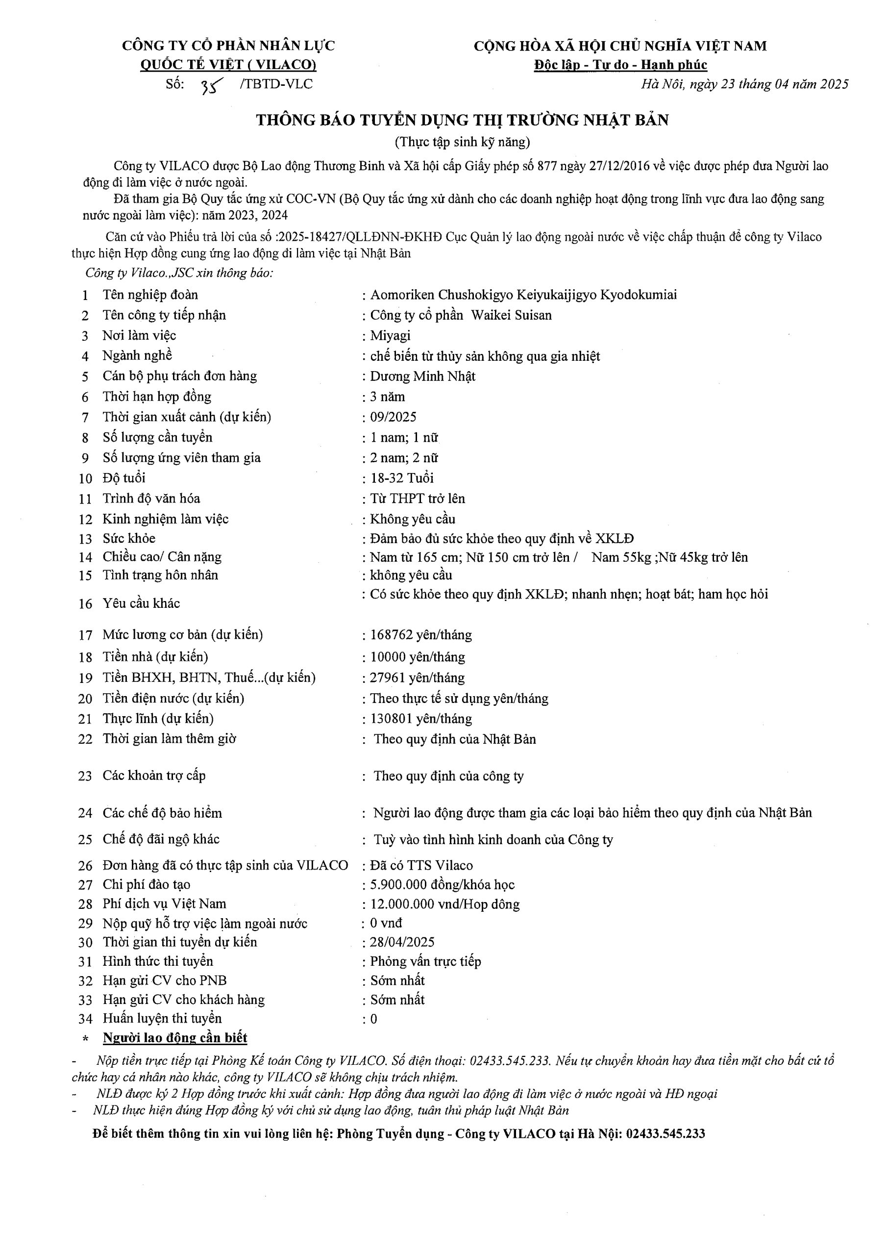 By admin 23/04/2025 No Comments 35/2025 TBTD-VLC: Thông báo tuyển dụng Đơn hàng Thực tập sinh ngành Chế biến thuỷ sản tại tỉnh Miyagi – Nhật Bản