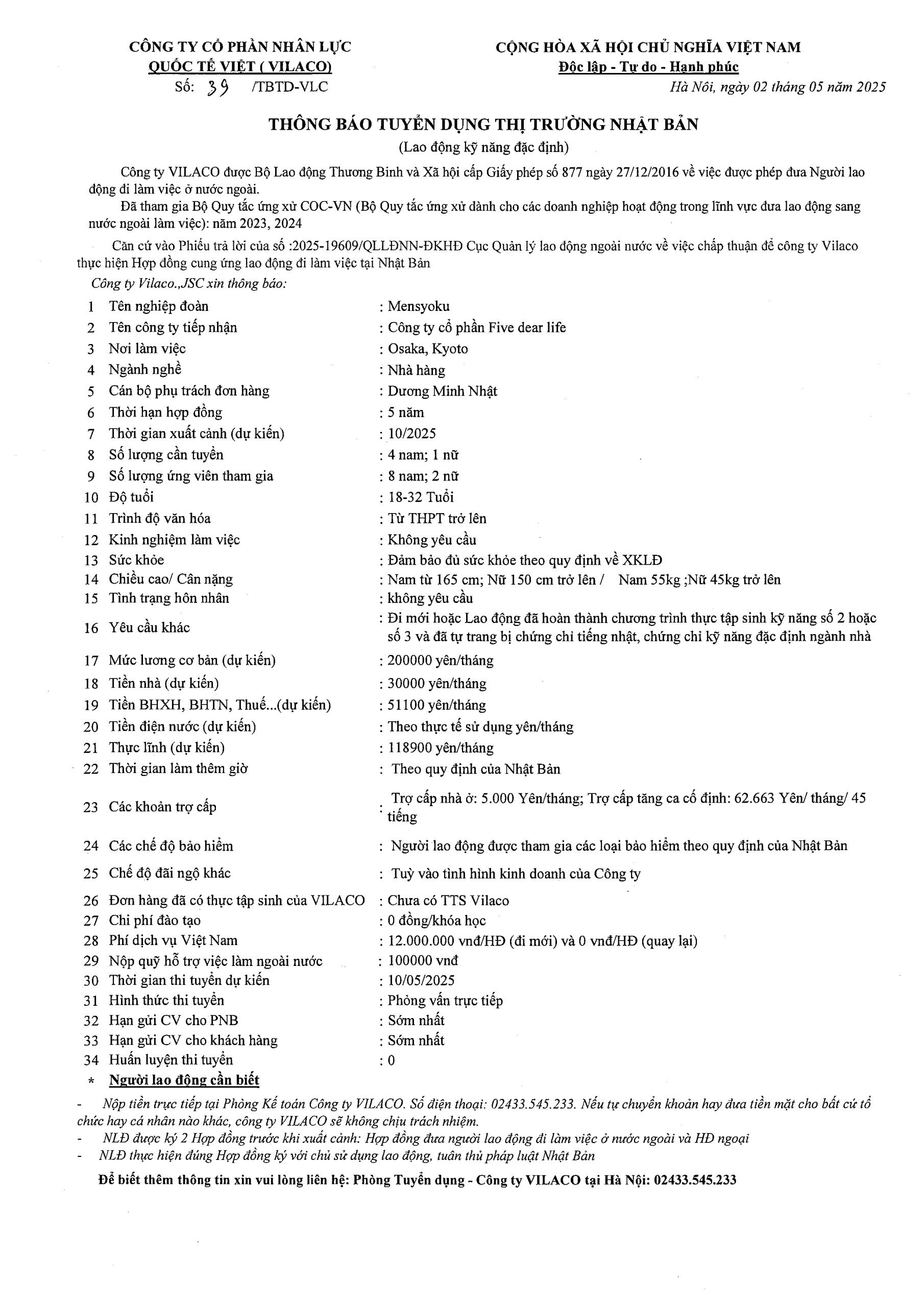 39/2025 TBTD-VLC: Thông báo tuyển dụng Đơn hàng Đặc định ngành Nhà hàng tại tỉnh Osaka, Kyoto – Nhật Bản