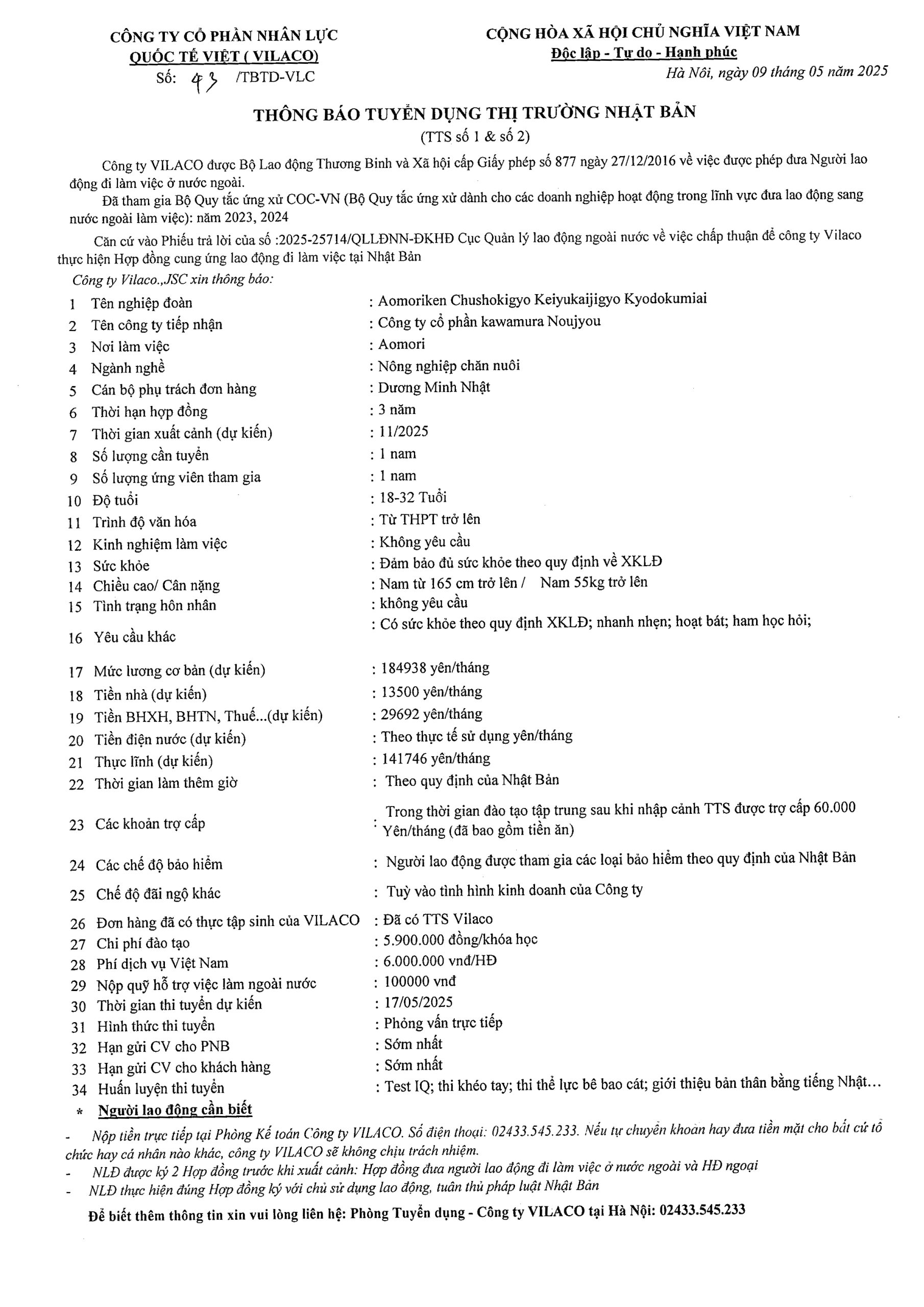 43/2025 TBTD-VLC: Thông báo tuyển dụng Đơn hàng Thực tập sinh ngành Nông nghiệp chăn nuôi tại tỉnh Aomori – Nhật Bản