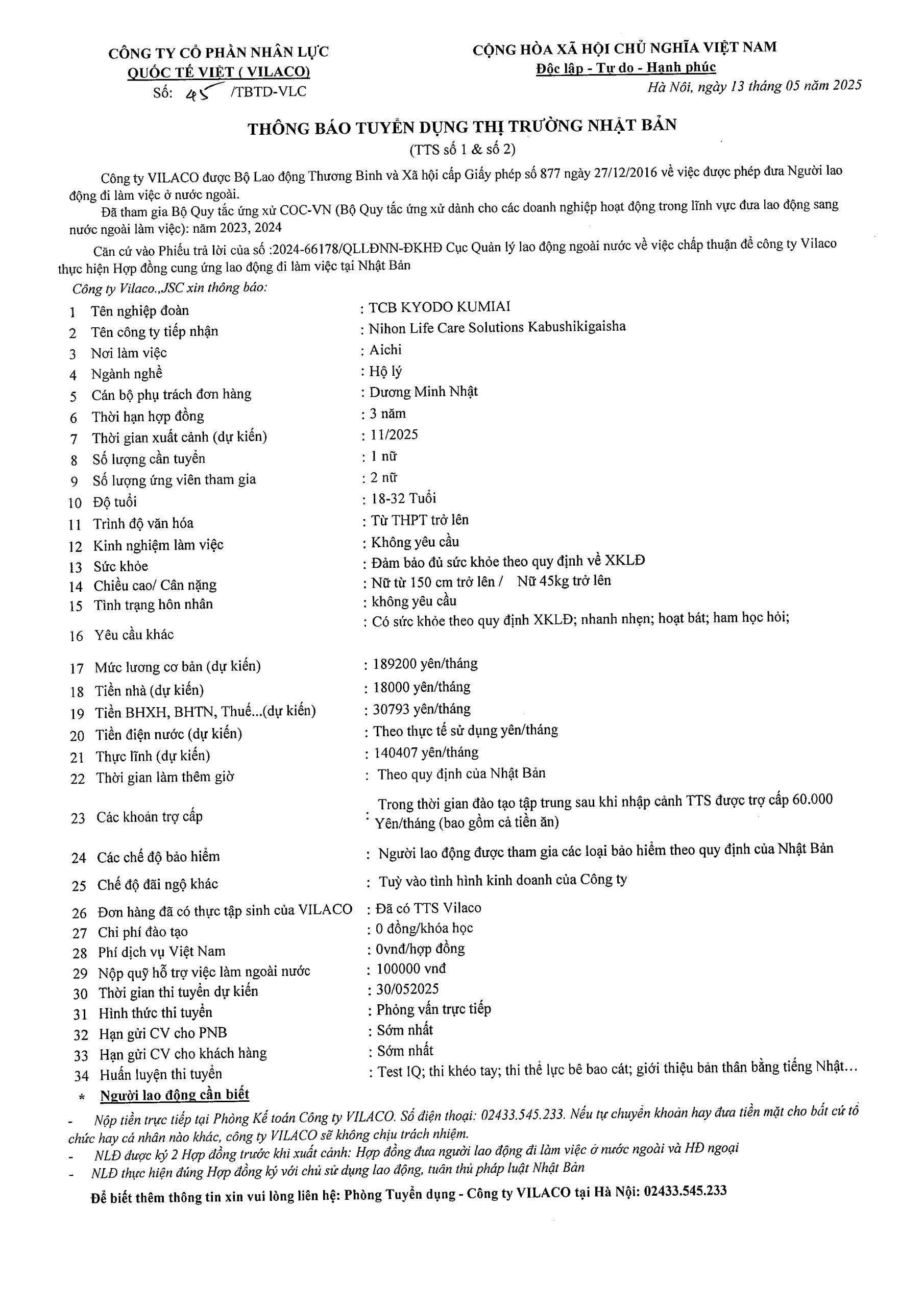 45/2025 TBTD-VLC: Thông báo tuyển dụng Đơn hàng Thực tập sinh ngành Hộ lý tại tỉnh Aichi – Nhật Bản