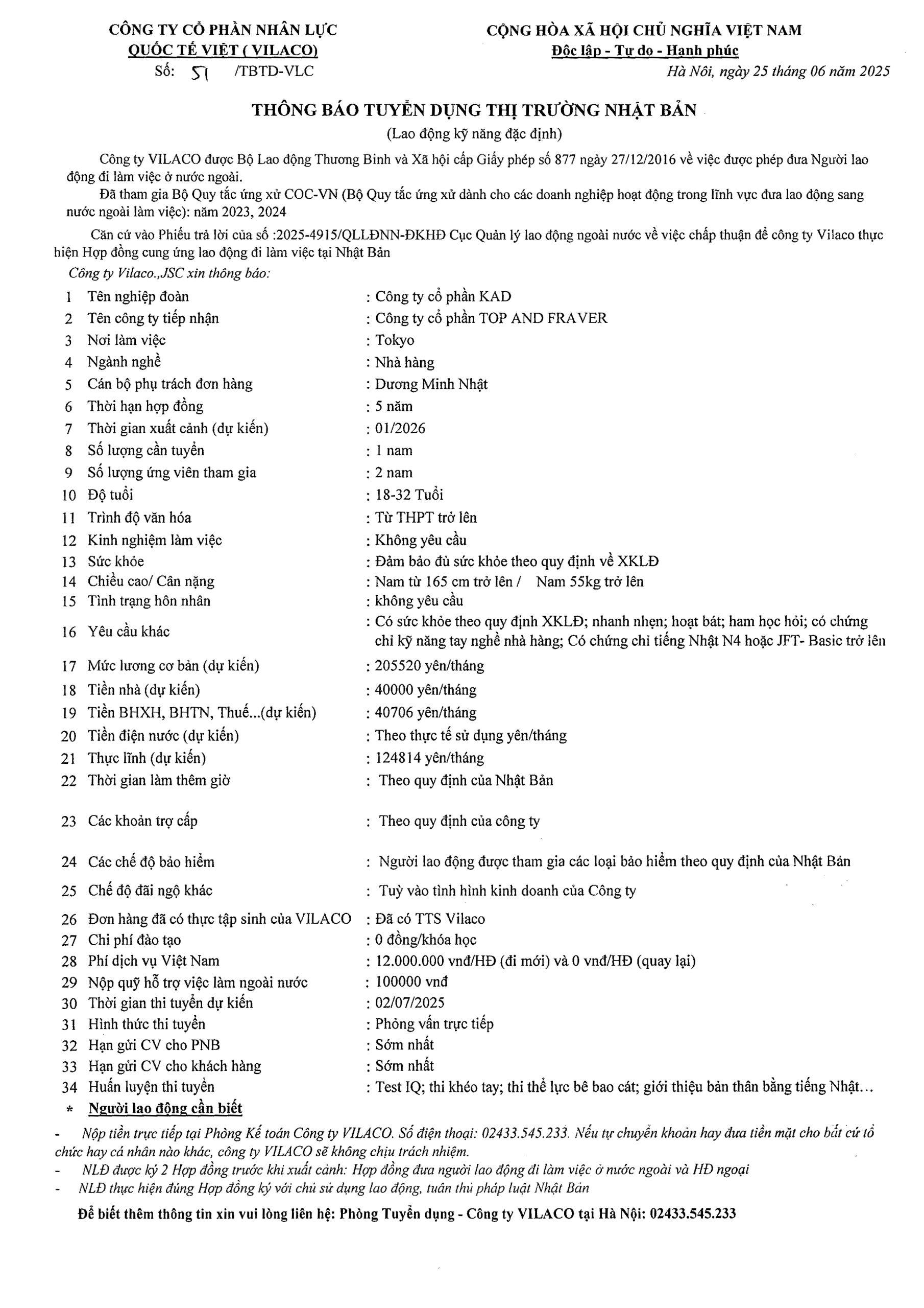 By admin 25/06/2025 No Comments 51/2025 TBTD-VLC: Thông báo tuyển dụng Đơn hàng Đặc định ngành Nhà hàng tại tỉnh Tokyo – Nhật Bản