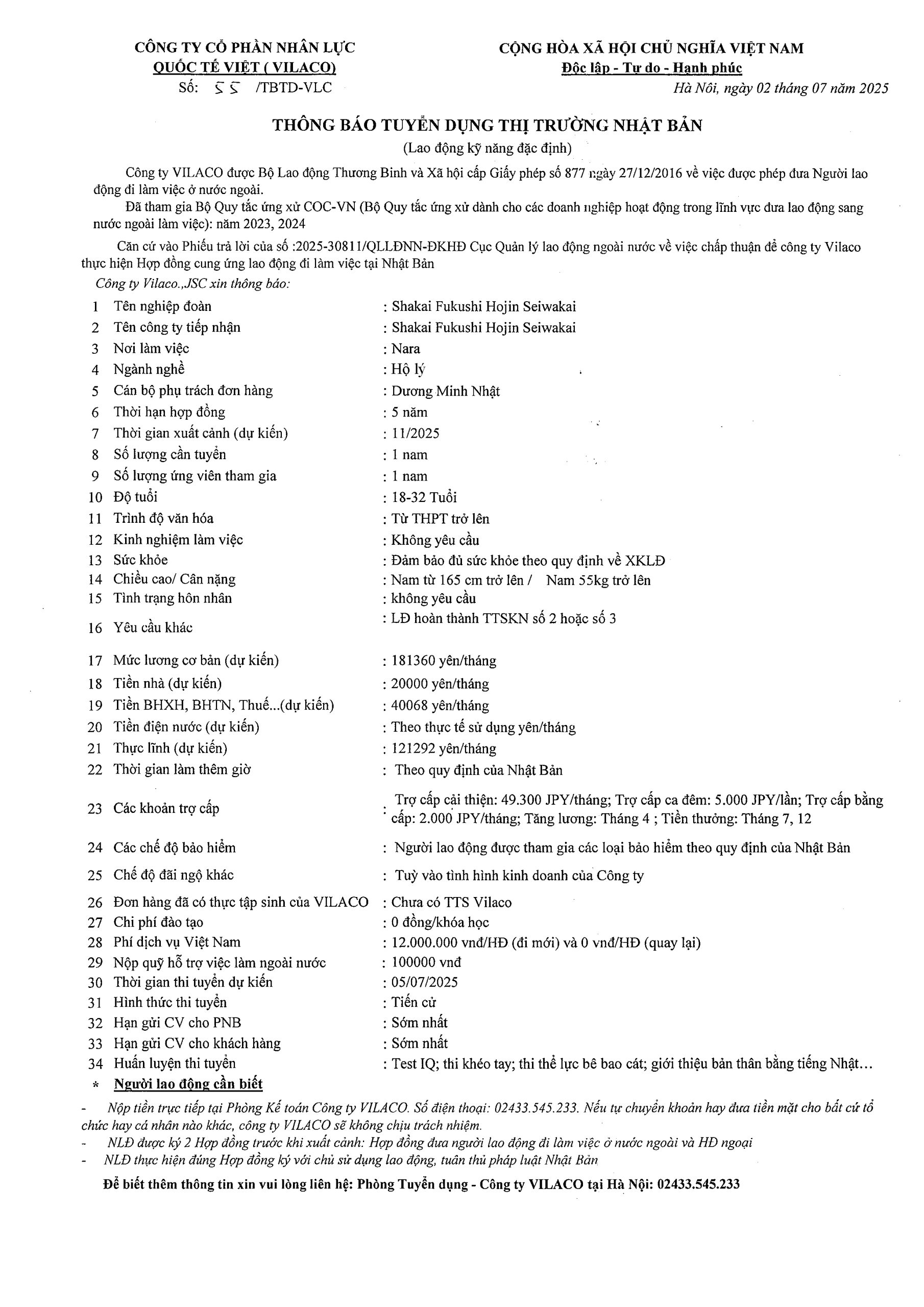55/2025 TBTD-VLC: Thông báo tuyển dụng Đơn hàng Đặc định ngành Hộ lý tại tỉnh Nara – Nhật Bản