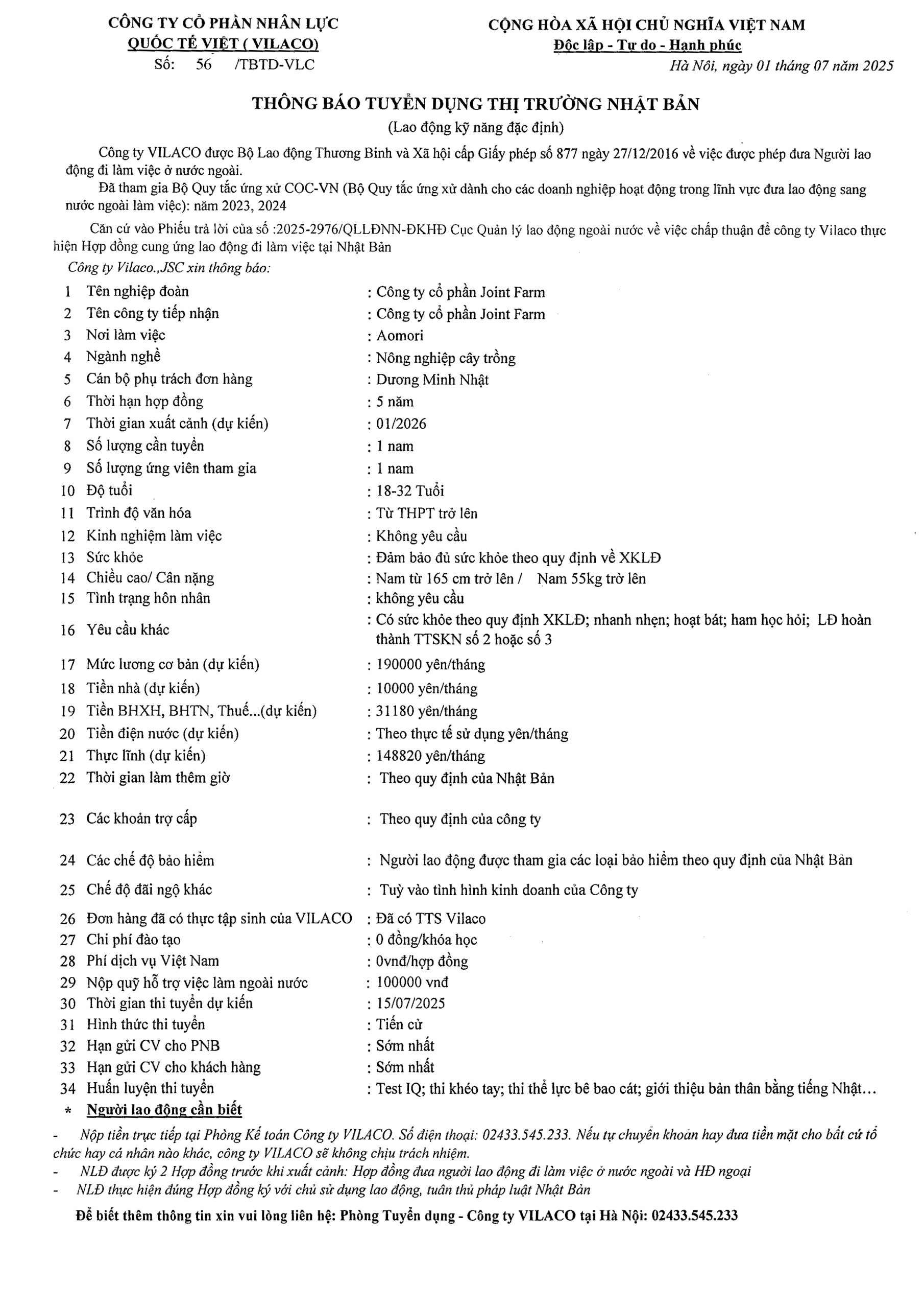 By admin 02/07/2025 No Comments 56/2025 TBTD-VLC: Thông báo tuyển dụng Đơn hàng Đặc định ngành Nông nghiệp tại tỉnh Aomori – Nhật Bản