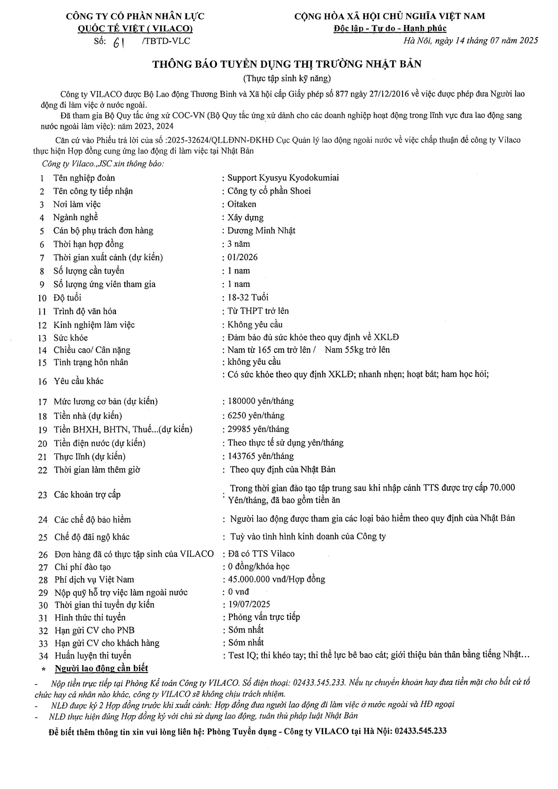 By admin 14/07/2025 No Comments 61/2025 TBTD-VLC: Thông báo tuyển dụng Đơn hàng Thực tập sinh ngành Xây dựng tại tỉnh Oita – Nhật Bản
