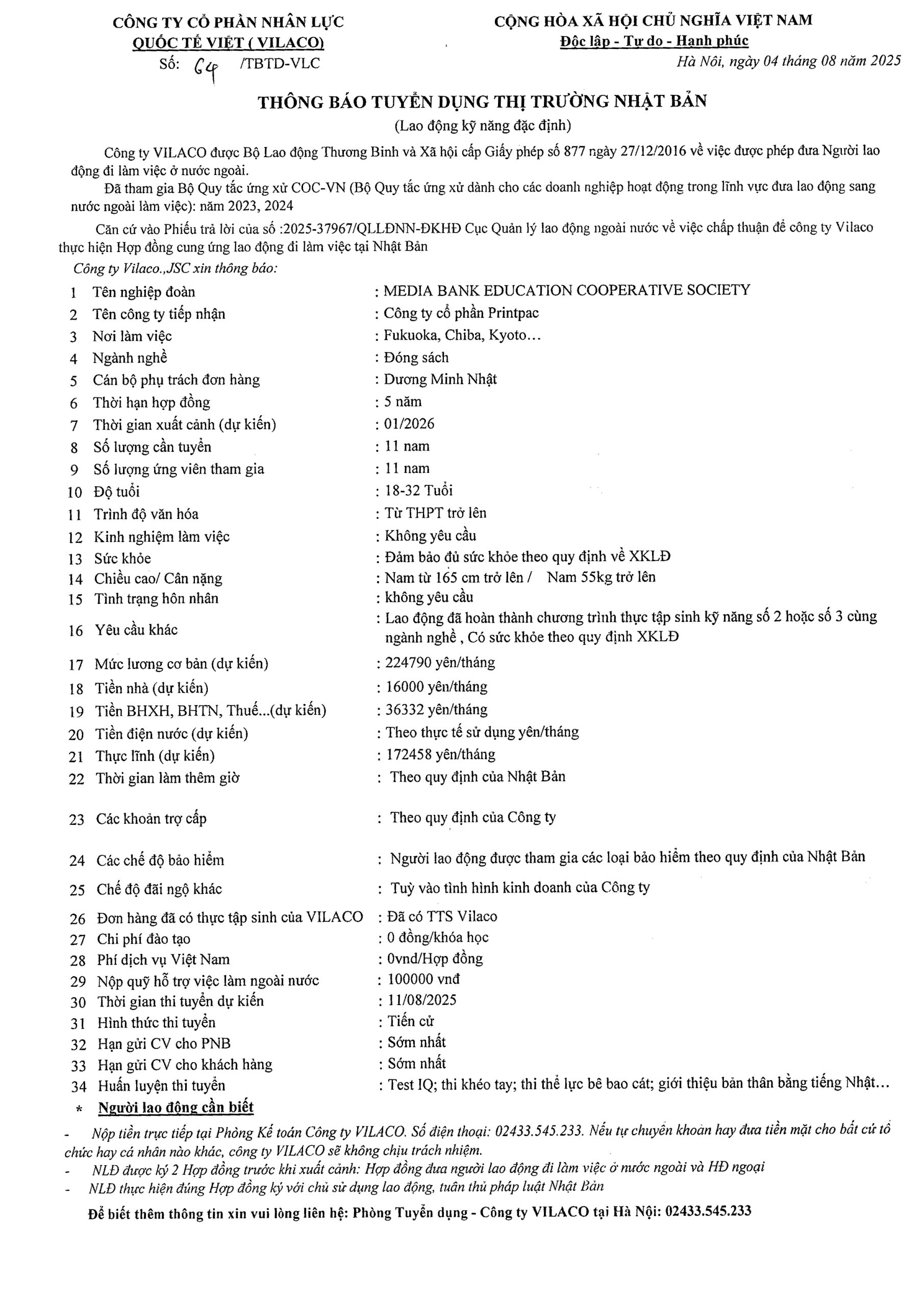 By admin 04/08/2025 No Comments 64/2025 TBTD-VLC: Thông báo tuyển dụng Đơn hàng Đặc định ngành Đóng sách tại tỉnh Fukuoka, chiba, kyoto.. – Nhật Bản