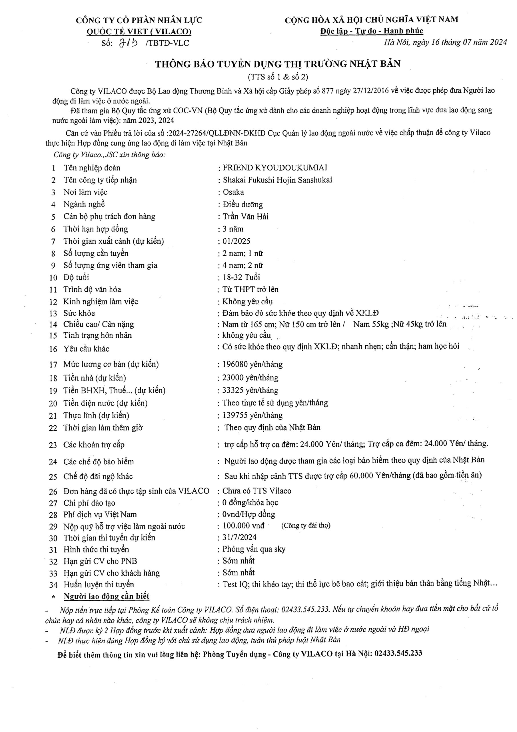 By admin 16/07/2024 No Comments 71b/2024 TBTD-VLC: Thông báo tuyển dụng Đơn hàng Hộ lý tại tỉnh Osaka – Nhật Bản