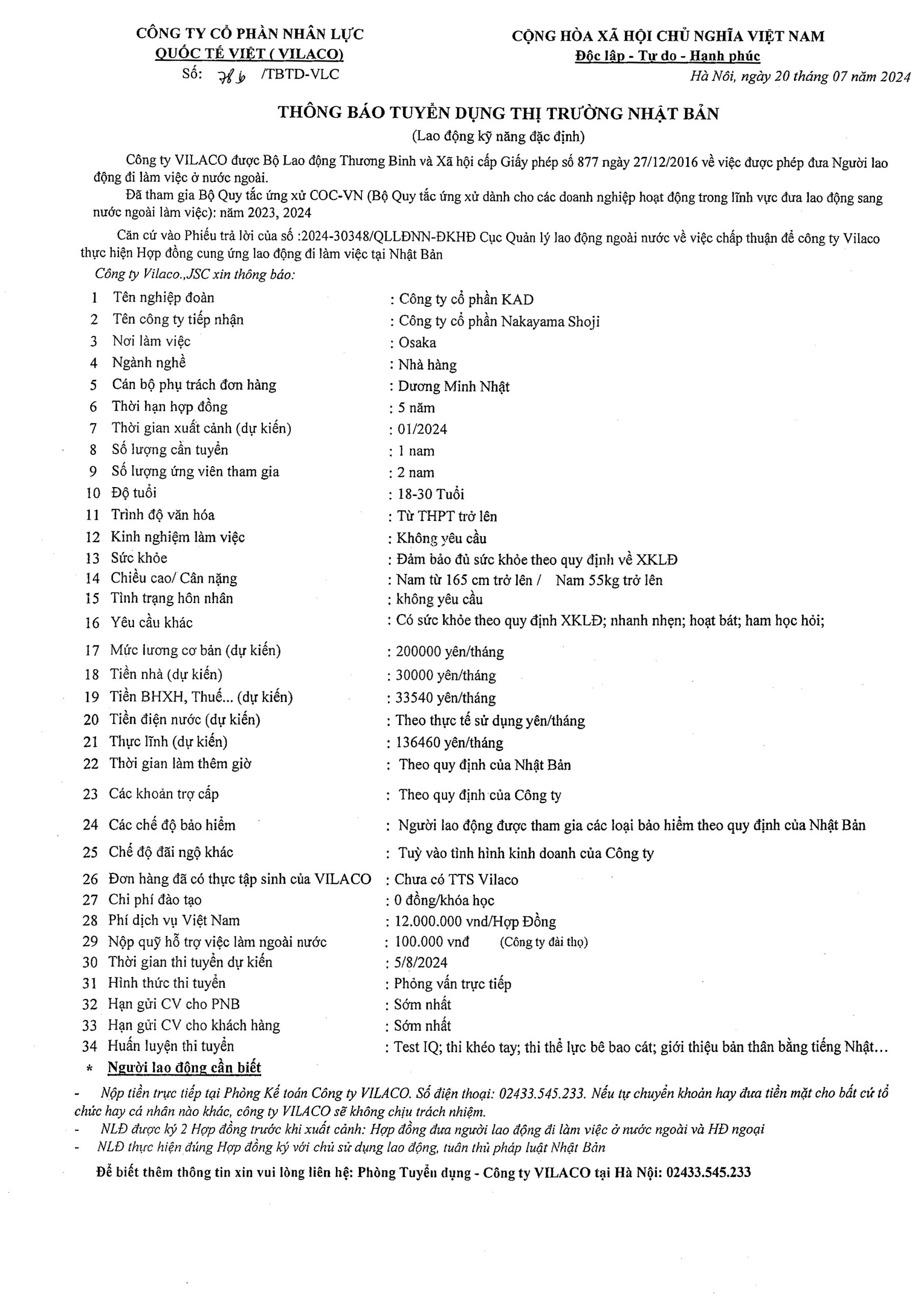 By admin 20/07/2024 No Comments 78b/2024 TBTD-VLC: Thông báo tuyển dụng Đơn hàng Lao động đặc định ngành Nhà hàng tại tỉnh Osaka – Nhật Bản