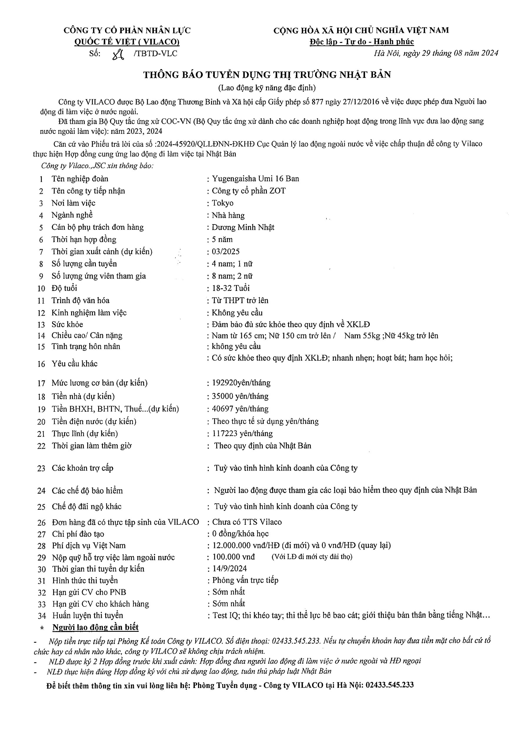 By admin 29/08/2024 No Comments 86/2024 TBTD-VLC: Thông báo tuyển dụng Đơn hàng Lao động đặc định ngành Nhà hàng tại tỉnh Tokyo – Nhật Bản