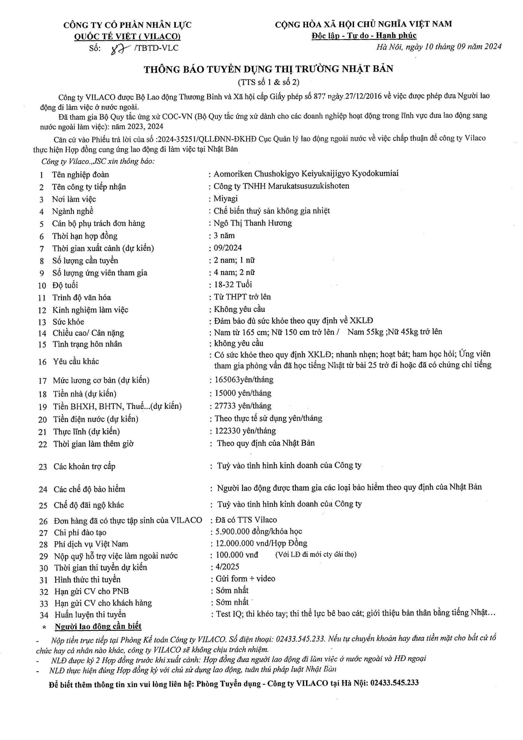 By admin 10/09/2024 No Comments 87/2024 TBTD-VLC: Thông báo tuyển dụng Đơn hàng Thực tập sinh ngành Chế biến Thuỷ sản tại tỉnh Miyagi – Nhật Bản