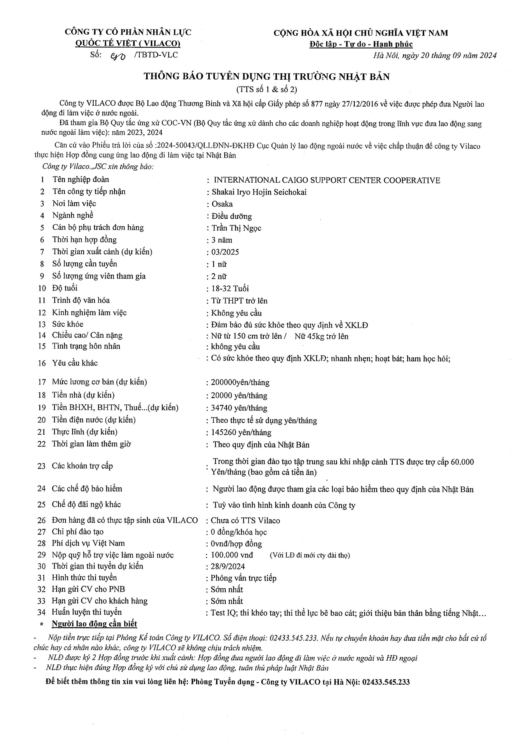 By admin 20/09/2024 No Comments 90/2024 TBTD-VLC: Thông báo tuyển dụng Đơn hàng Thực tập sinh ngành Hộ lý tại tỉnh Osaka – Nhật Bản