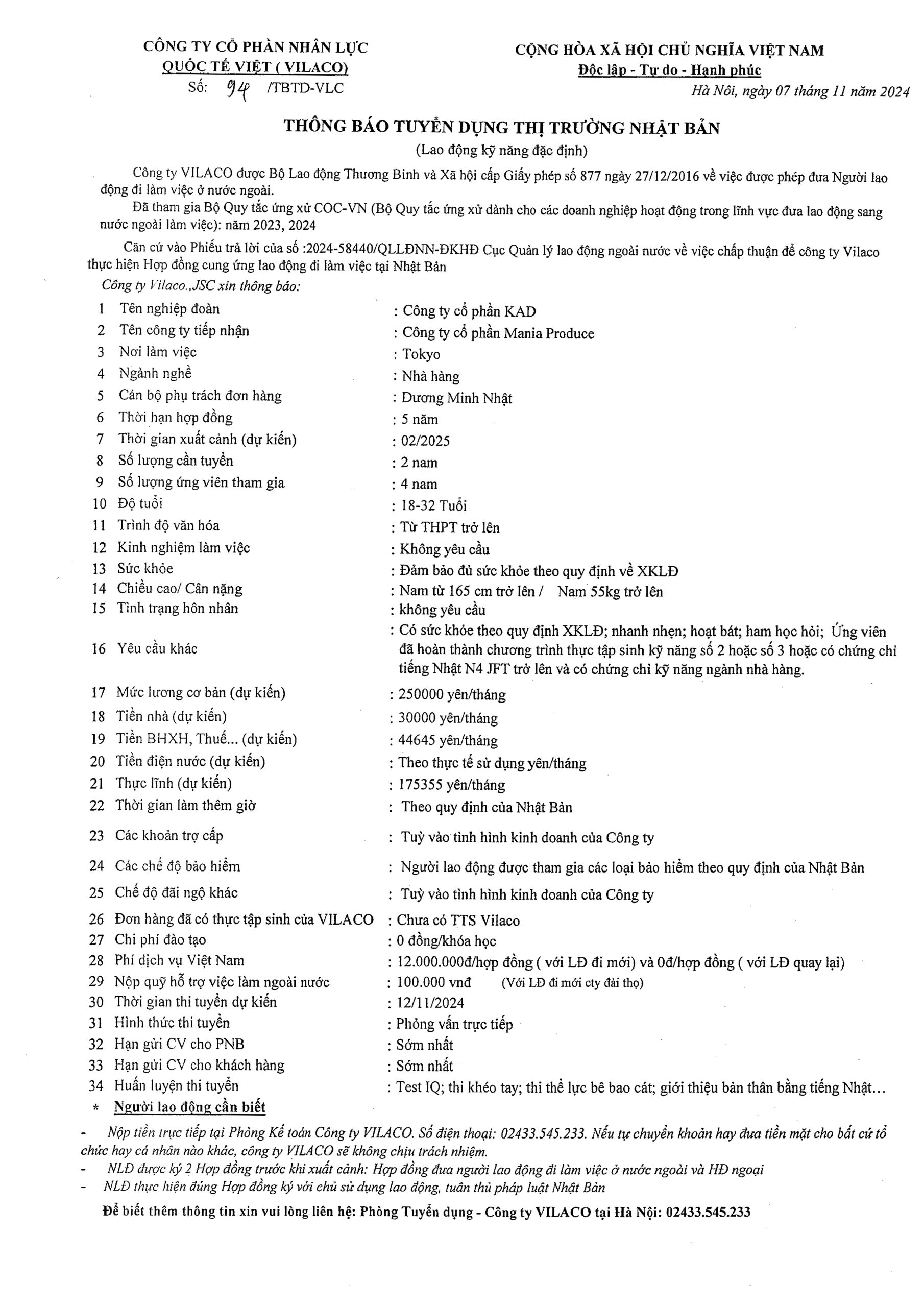 By admin 07/11/2024 No Comments 94/2024 TBTD-VLC: Thông báo tuyển dụng Đơn hàng Đặc định sinh ngành Nhà hàng tại tỉnh Tokyo – Nhật Bản