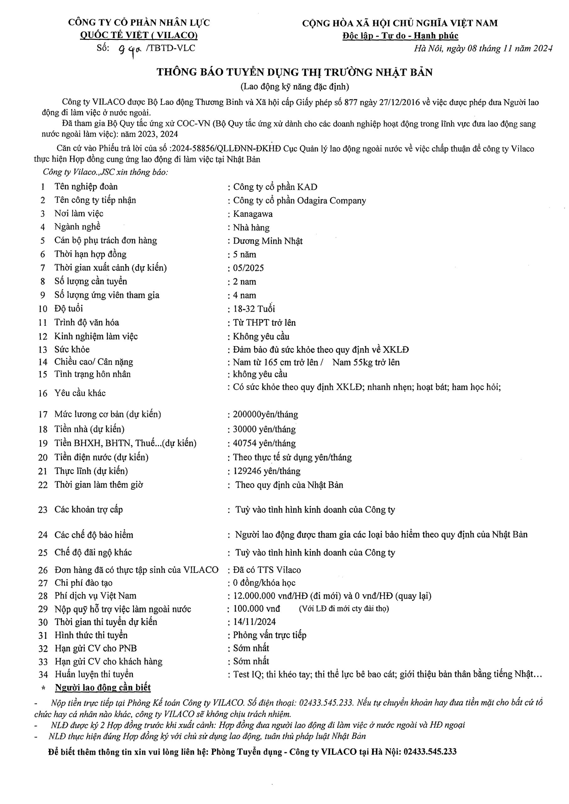 By admin 08/11/2024 No Comments 94a/2024 TBTD-VLC: Thông báo tuyển dụng Đơn hàng Đặc định sinh ngành Nhà hàng tại tỉnh Kangawa – Nhật Bản a