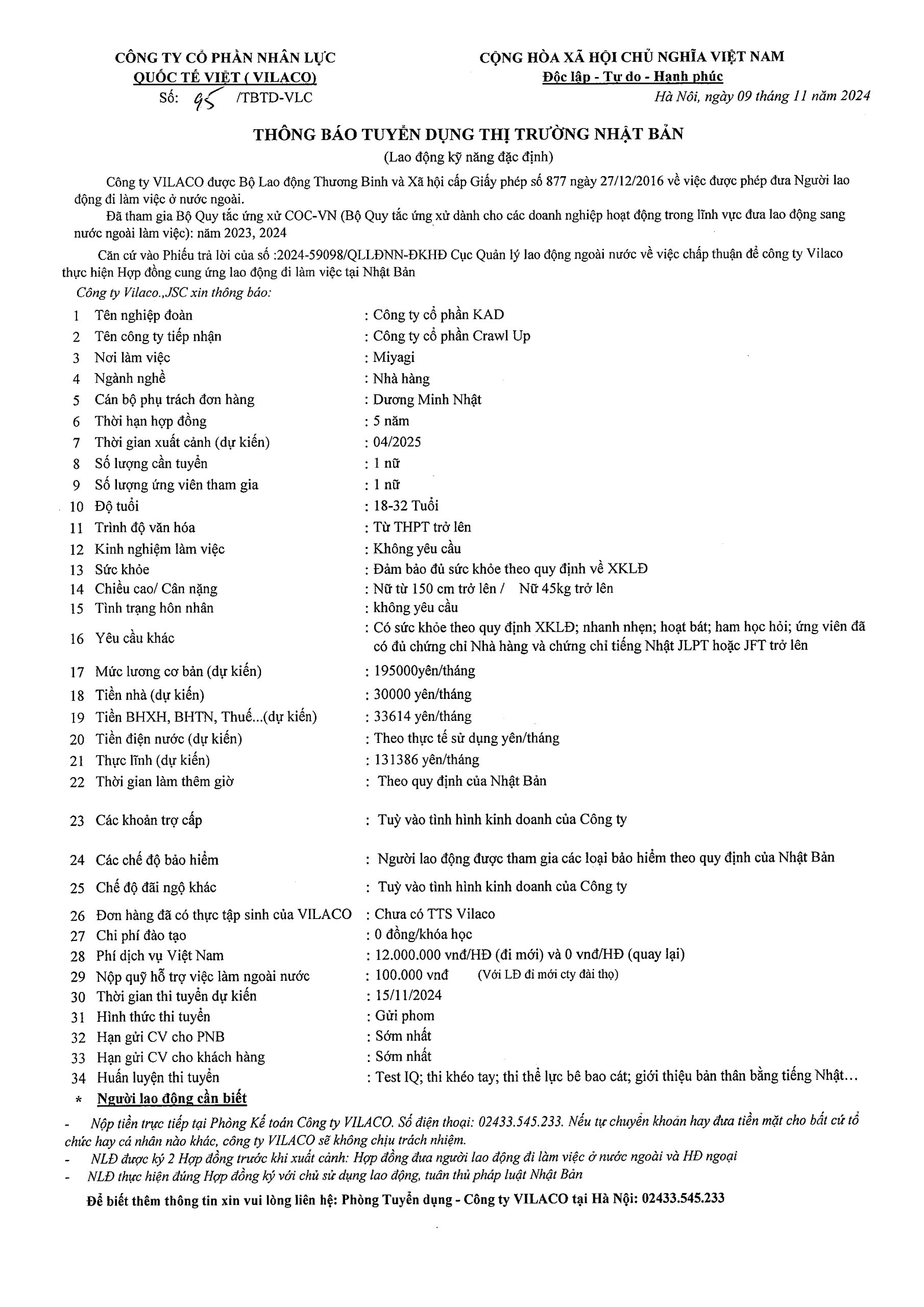 By admin 09/11/2024 No Comments 95/2024 TBTD-VLC: Thông báo tuyển dụng Đơn hàng Đặc định sinh ngành Nhà hàng tại tỉnh Miyagi – Nhật Bản