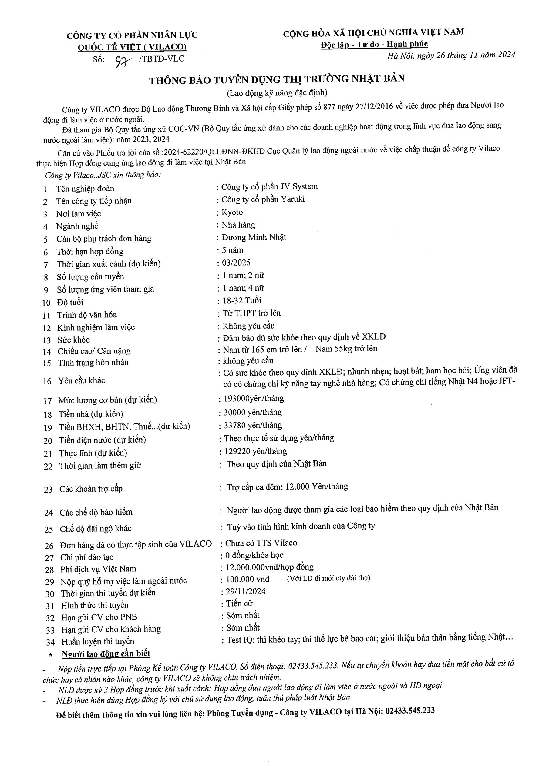 By admin 26/11/2024 No Comments 97/2024 TBTD-VLC: Thông báo tuyển dụng Đơn hàng Đặc định sinh ngành Nhà hàng tại tỉnh Kyoto – Nhật Bản
