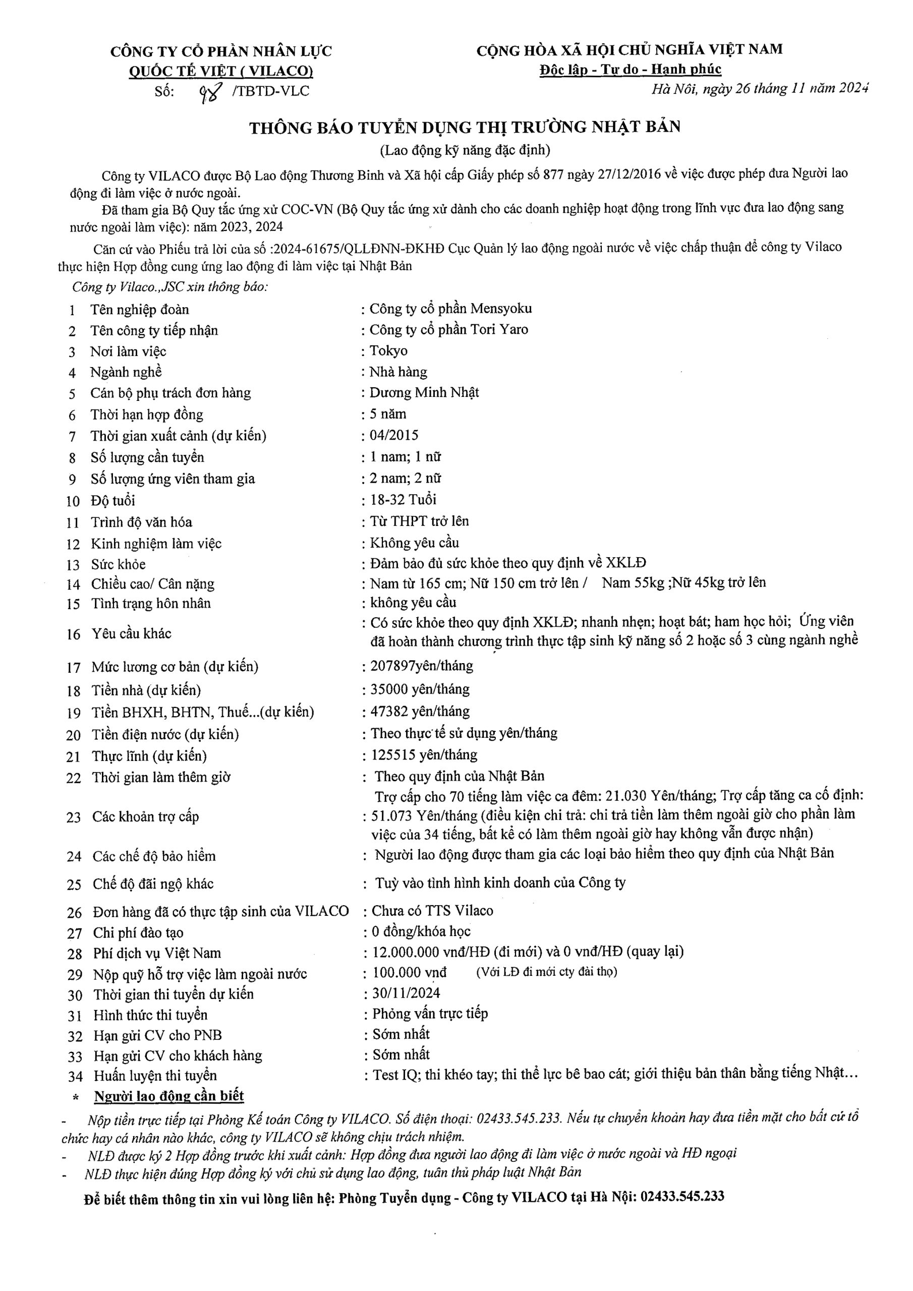 By admin 26/11/2024 No Comments 98/2024 TBTD-VLC: Thông báo tuyển dụng Đơn hàng Đặc định sinh ngành Nhà hàng tại tỉnh Tokyo – Nhật Bản