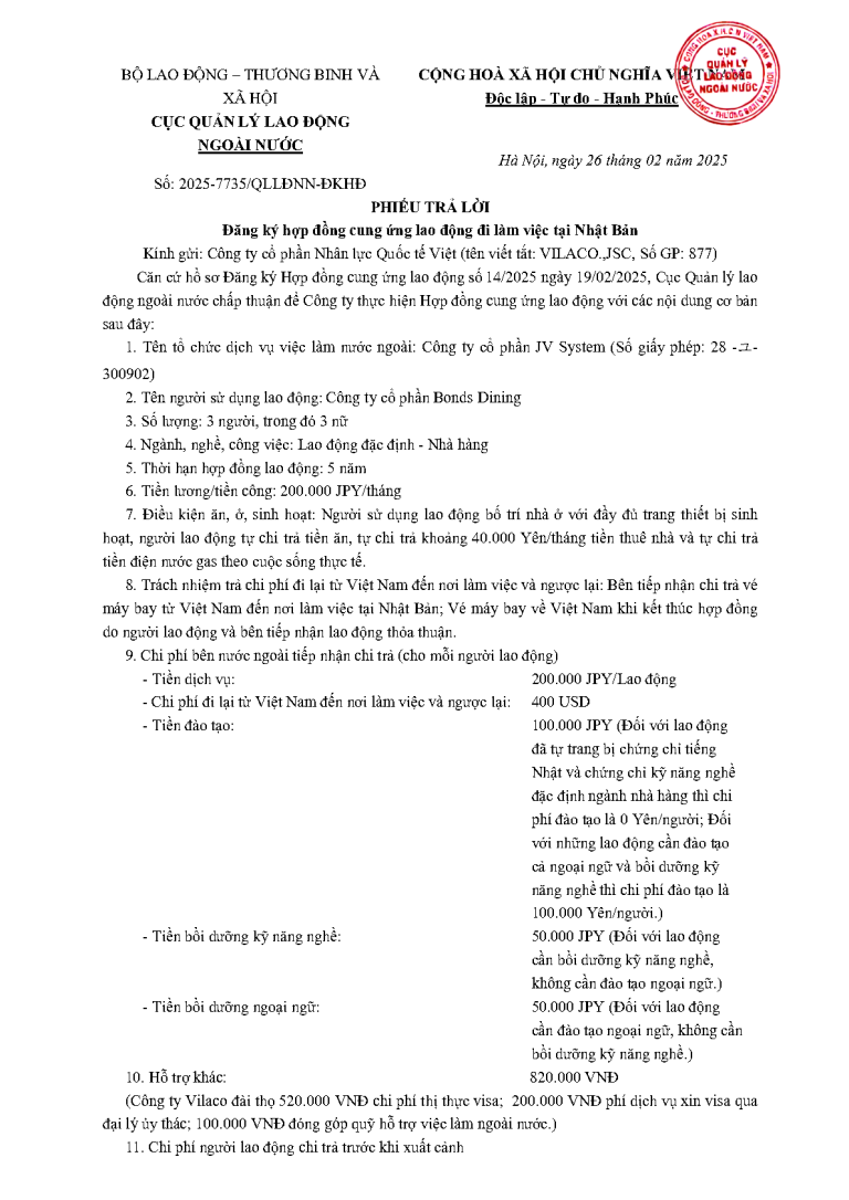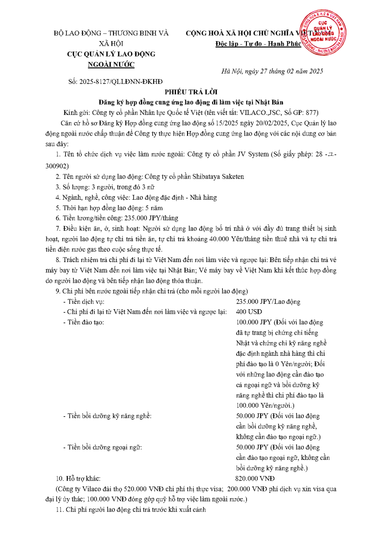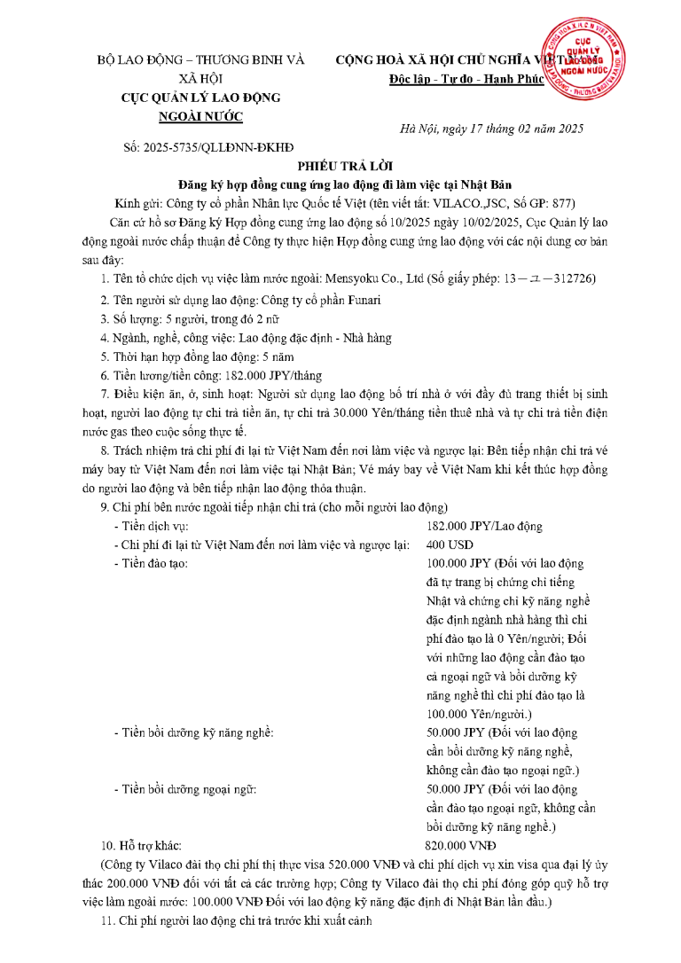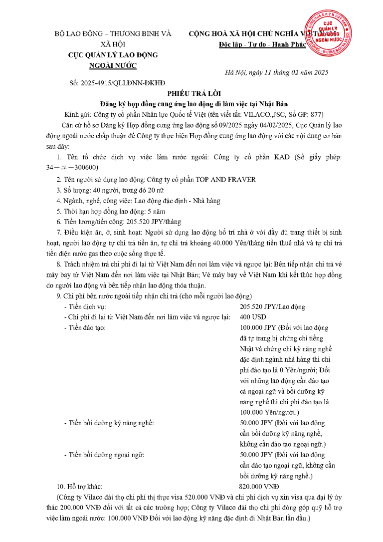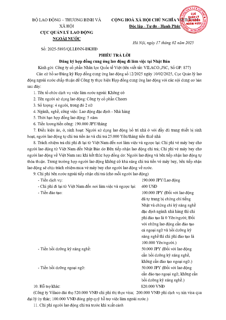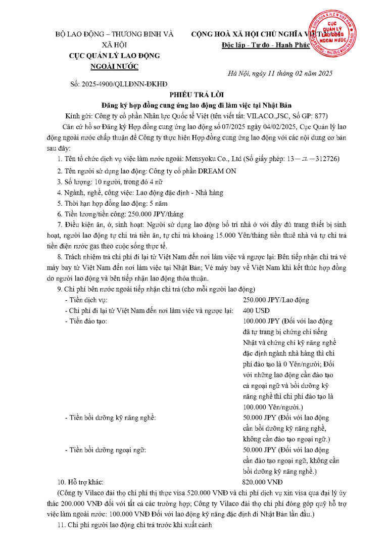 PTL _2025-4854 QLLĐNN-ĐKHĐ ngày 11/02/2025 của Cục Quản lý lao động ngoài nước