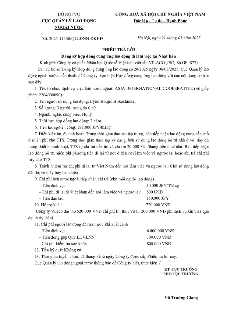PTL _2025-3454QLLĐNN-ĐKHĐ ngày 24/01/2025 của Cục Quản lý lao động ngoài nước